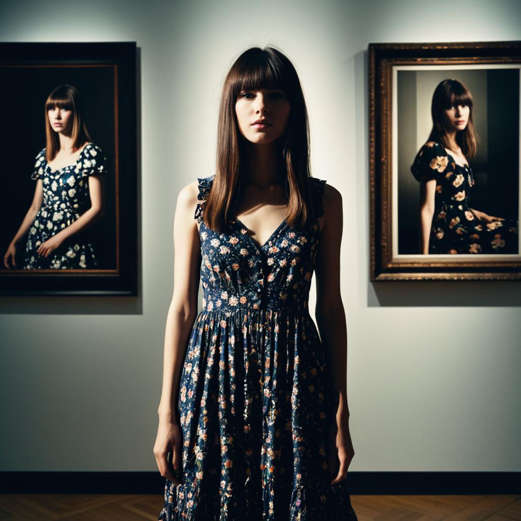 Long Fringe hairstyle on woman, wearing floral sundress, in art gallery, captured in fashion editorial style with dramatic spotlight.