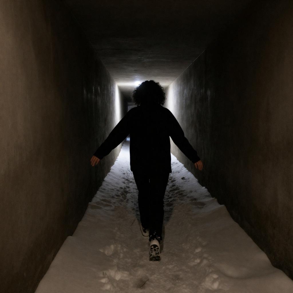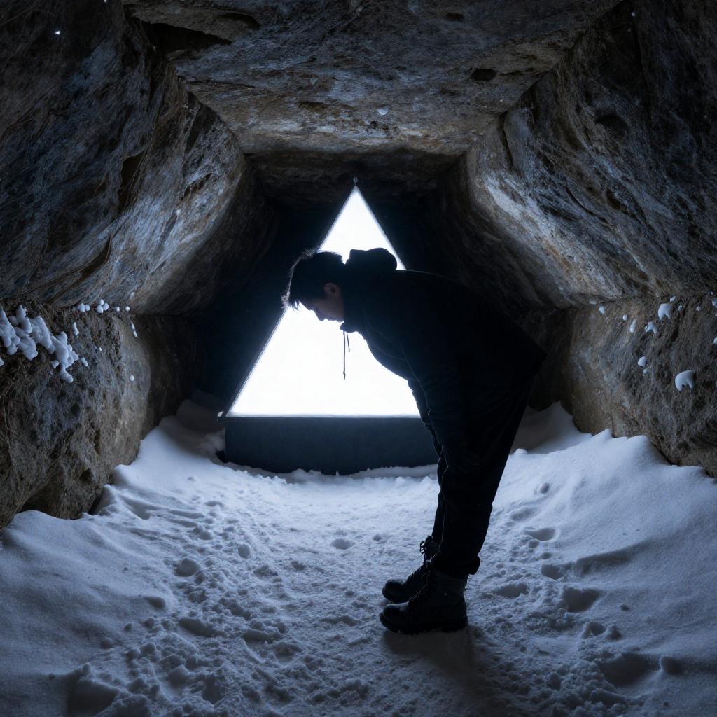 Silhouetted figure in dark clothing bends forward in a snow-covered cave, illuminated by a bright, triangular light source at the cave's end. Snow-covered walls frame the figure. Dim, blue-gray lighting. Sturdy boots on the ground.
