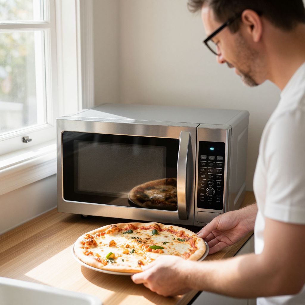 A cozy home kitchen scene with natural sunlight streaming through the window, featuring a friendly middle-aged man with a stubble face and glasses, placing a frozen pizza into a shiny stainless steel microwave, the appliance sitting in the corner with a subtle 'heating' indicator glowing softly.