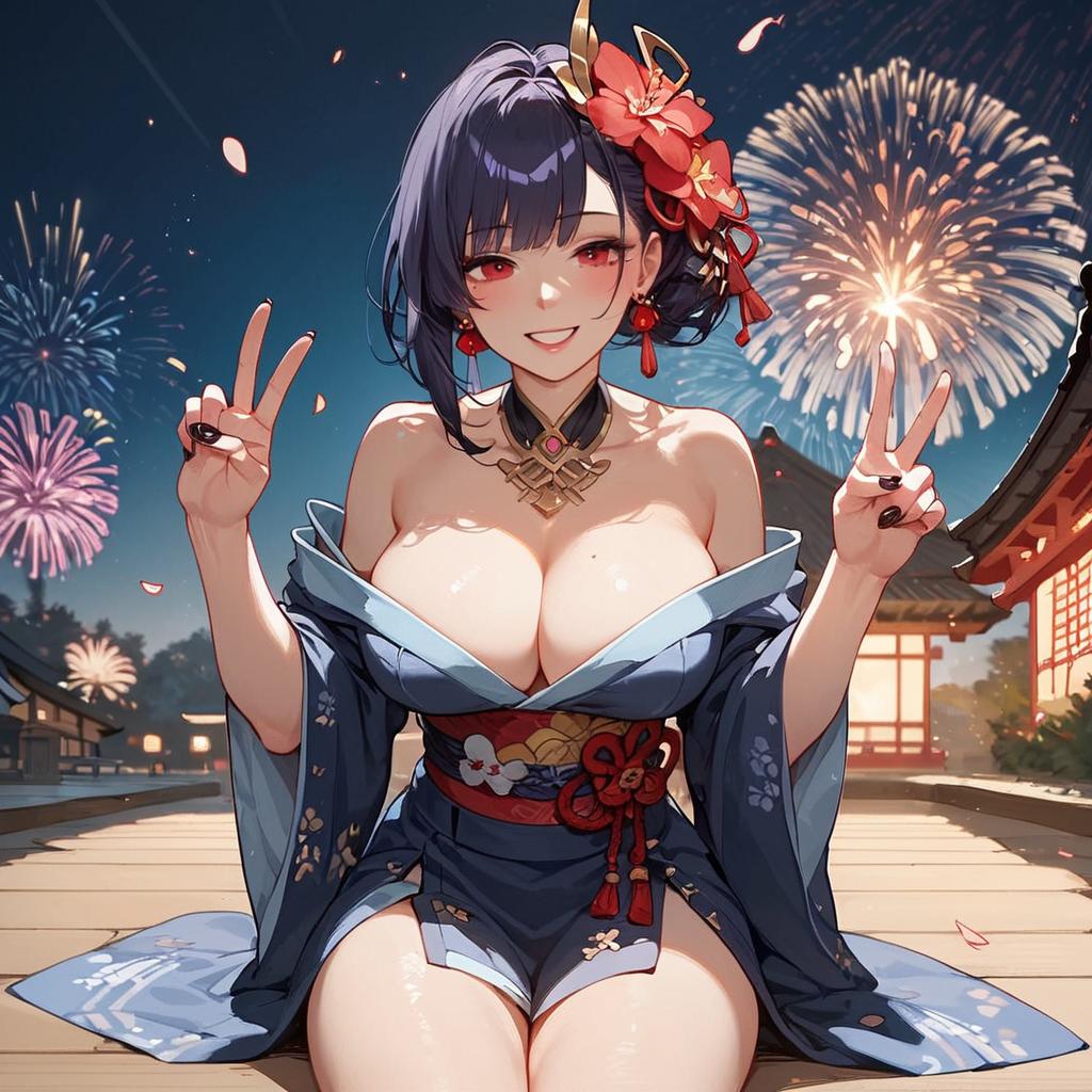 Score_9, score_8_up, score_7_up, score_6_up, score_5_up, score_4_up, source_anime, 1girl, solo, anime screencap, smile, looking at viewerkimono, fireworks, peace sign, painted nails, large breasts