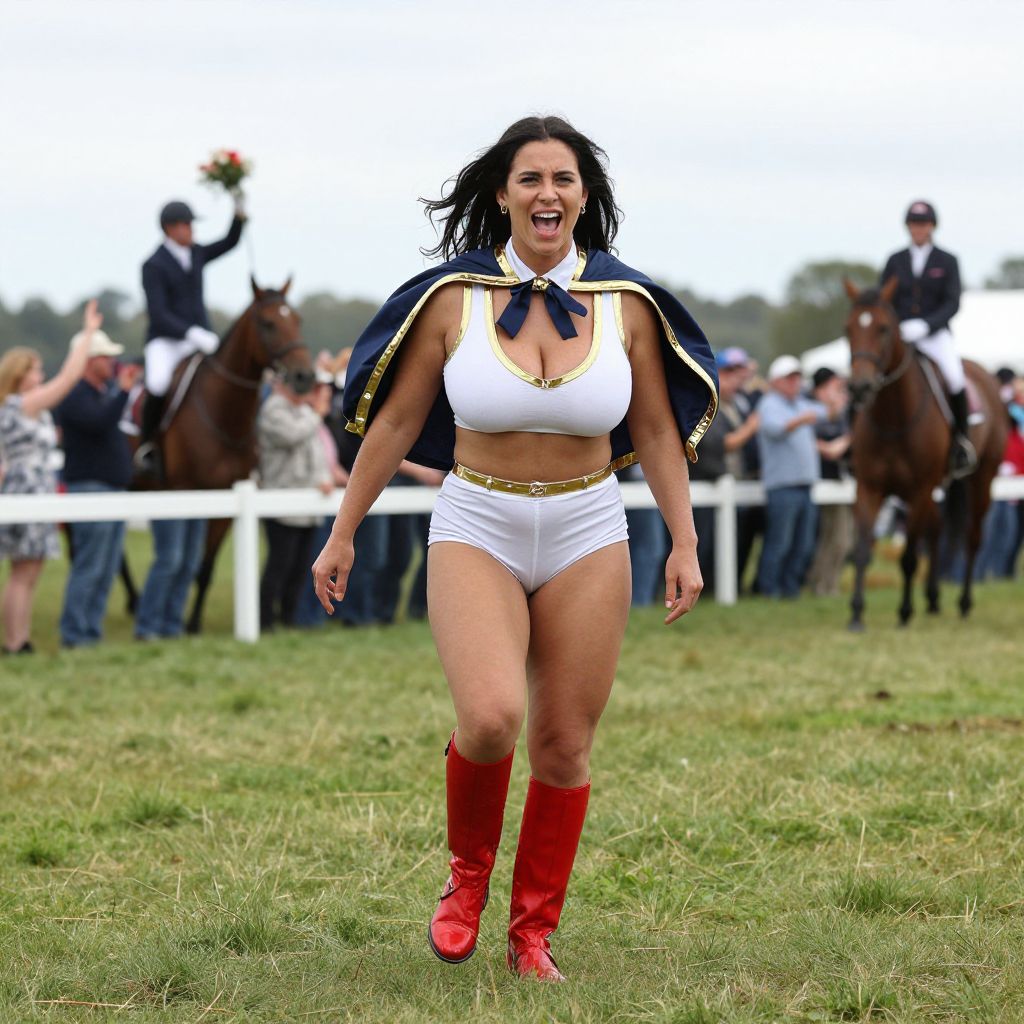 A full-body photo of a woman in a festive jockey costume, complete with a gold trim, red racing boots, and a shoulder-length riding cape, posing mid-action in a rural countryside setting during a regional horse festival, her face is expressive with a mix of pride and joy, her dark eyes spark with enthusiasm, and the background features cheering crowd and horseback riders.. The woman has big tits and cute face