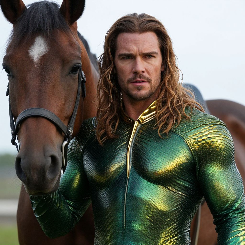 Movie Quality Aquaman Costume, a close up of a man in a green outfit standing next to a horse