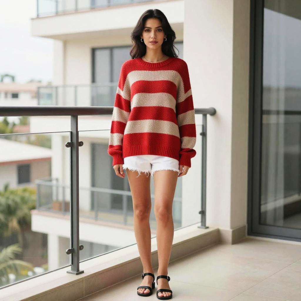 A woman in a casual contemporary style, wearing an oversized red and beige striped sweater layered over white shorts and black strappy sandals, stands on a balcony in a modern apartment, captured in the visual style of JC Staff. Sexy. Pretty face and beutiful eyes