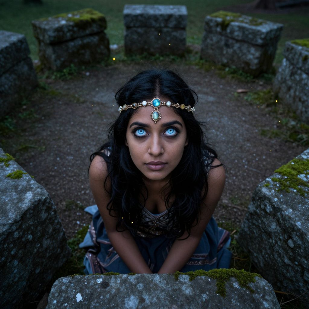 A photograph-like digital illustration of a dark-haired woman with strikingly bright blue eyes and olive skin, kneeling between ancient, moss-covered stone blocks. She wears a delicate, silver headpiece with a central turquoise gem and a sleeveless, patterned dress. Her intense gaze is directed upwards, creating a mystical, enchanting effect. The background shows a gravel path surrounded by the stone blocks, with a blurred, greenish field in the distance. The image has a surreal, fantasy vibe, with a focus on her vivid eyes and the ancient, natural setting.