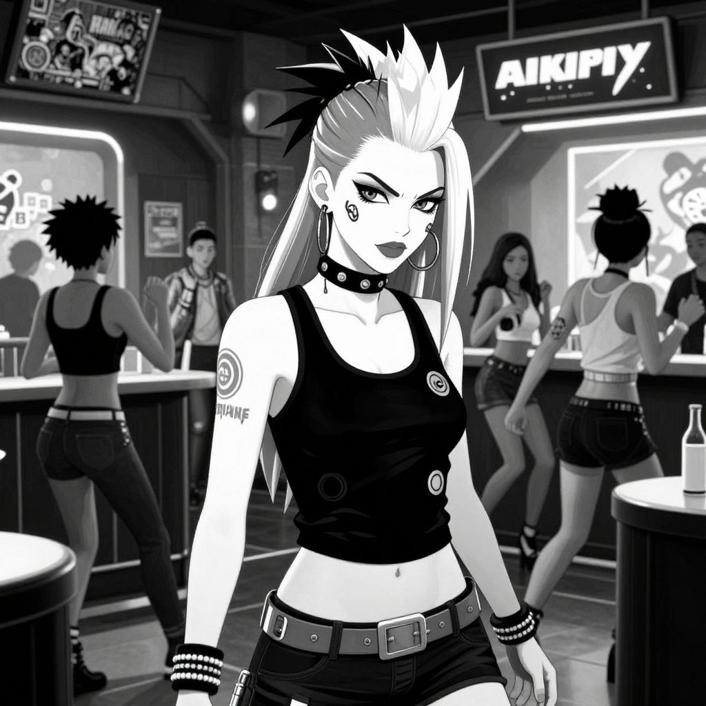The image depicts a cyberpunk scene set in a bustling dance club, rendered in a striking black and white style reminiscent of Tank Girl. The central figure, a woman with striking features and a confident demeanor, stands prominently in the foreground. She sports a distinctive hairstyle with white spikes and wears a black tank top adorned with circular patterns. Her face is marked with a unique tattoo, adding to her edgy appearance. In the background, other club-goers are engaged in various activities, some of whom are seen in motion, suggesting a lively atmosphere. The club's interior is detailed with various elements, including a railing, posters, and a signboard, contributing to the urban, gritty ambiance. The overall composition is dynamic, with the central figure drawing the viewer's attention, while the surrounding elements create a sense of depth and movement.