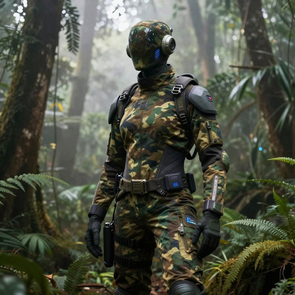 Futuristic suit with adaptive camouflage, blending into a dense jungle environment, equipped with advanced tech gadgets, misty morning light filtering through tall trees