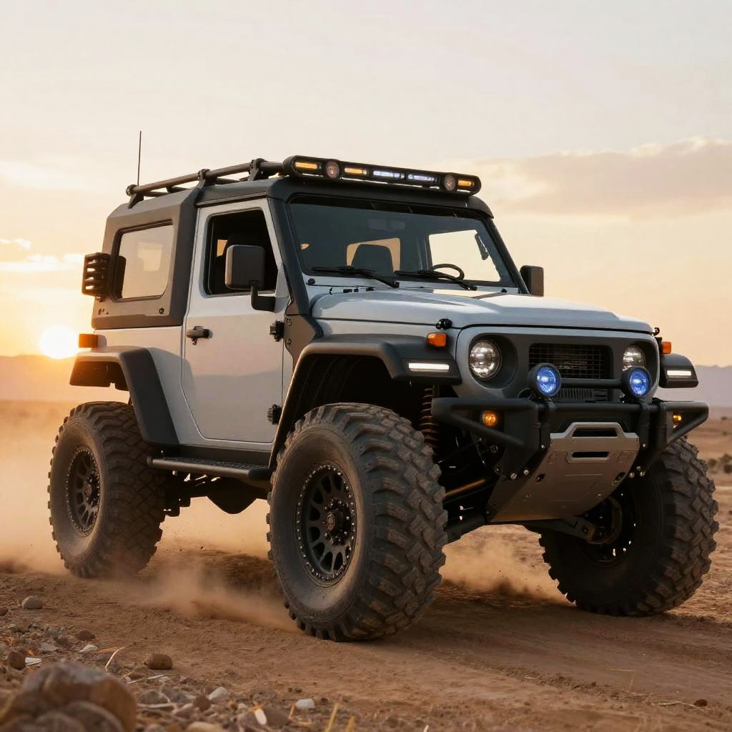 AI vehicle generator designing modular off-road vehicles with adaptive terrain features, rugged wheels and AI sensors scanning surroundings, dramatic sunset background with dust particles, detailed mechanical textures, exploration and adventure theme in a semi-futuristic landscape