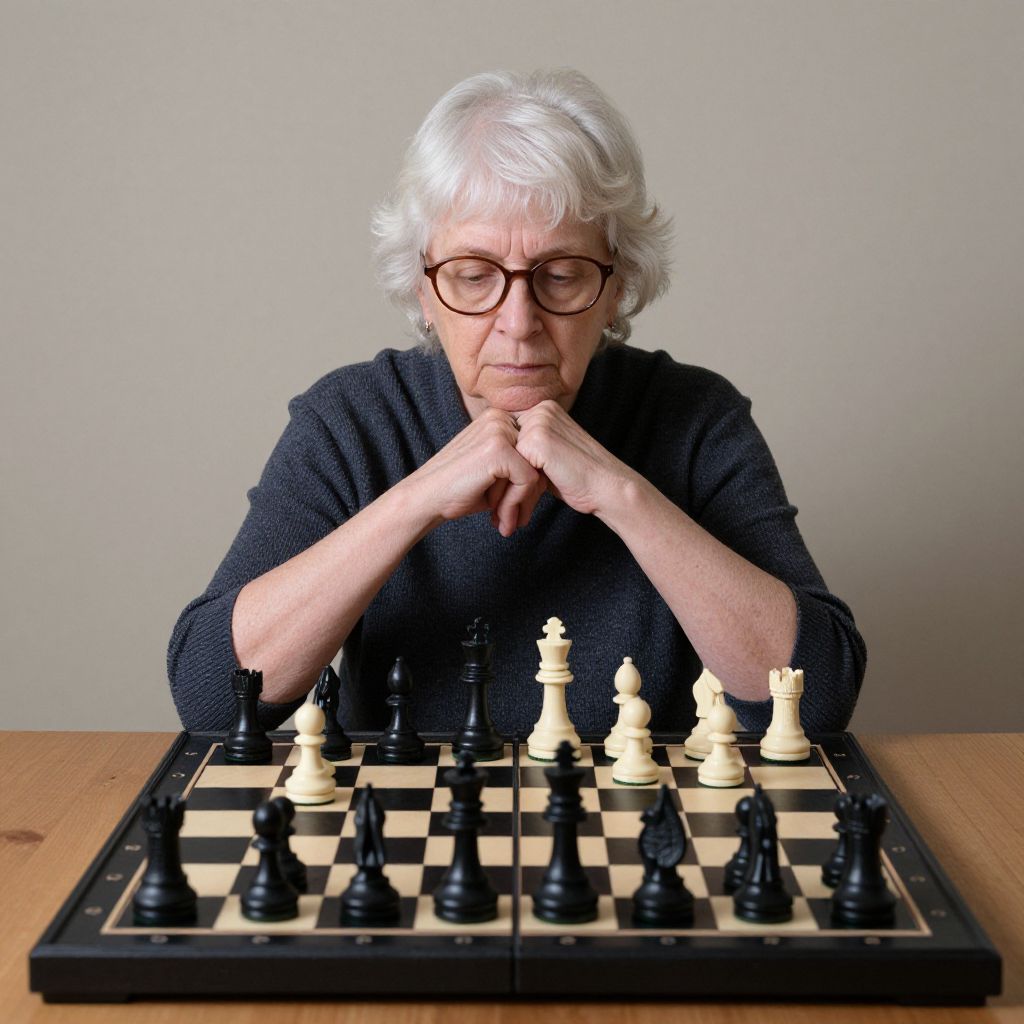 Concentrated elderly woman with white hair and glasses sits at a wooden table, her hands clasped above a chessboard filled with intricately carved black and white pieces, as she contemplates her next move in a quiet, contemplative setting.