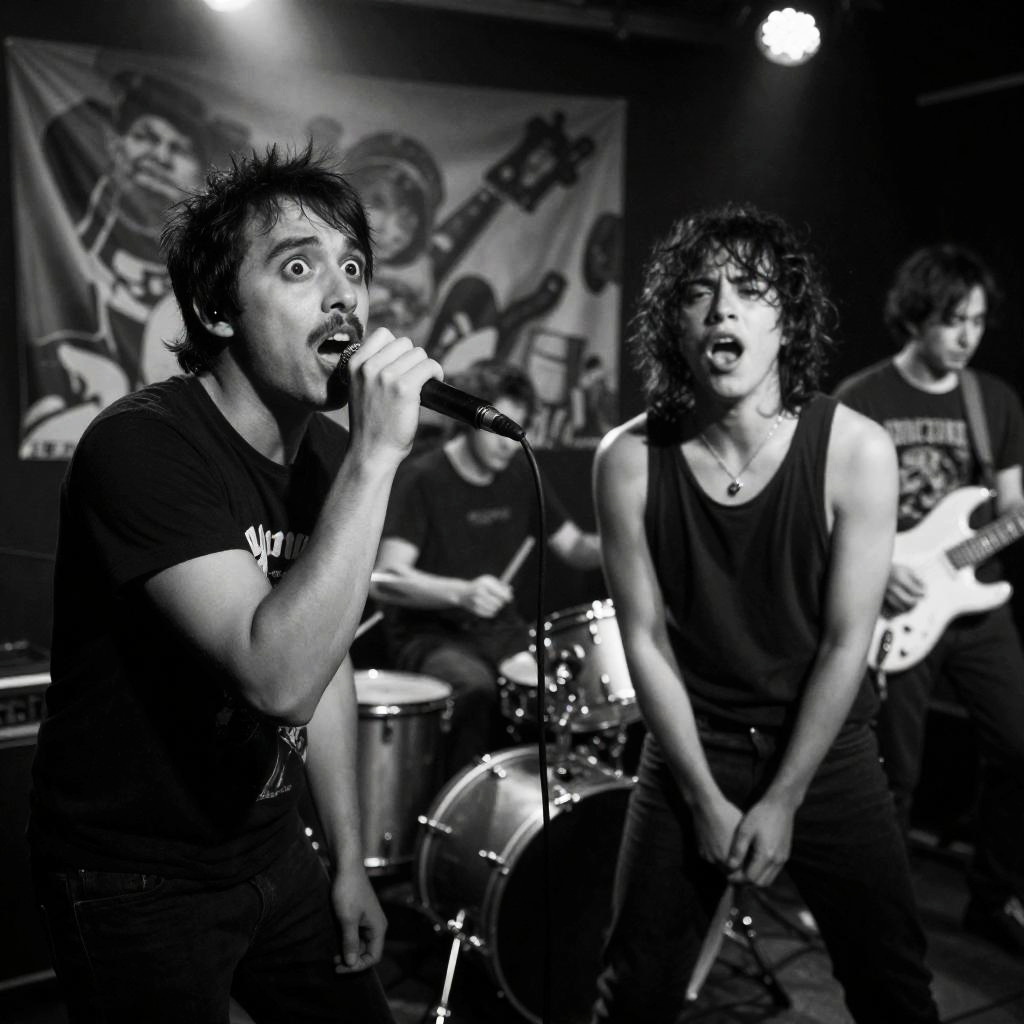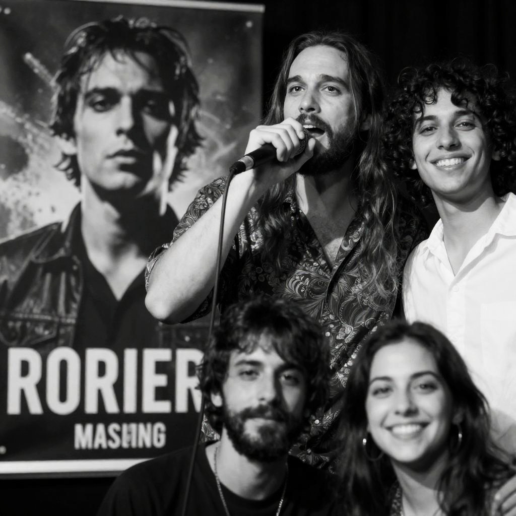 Photograph of a male musician with long hair and a beard, singing into a microphone, wearing a patterned shirt. Beside him, a person with curly hair and a white shirt smiles. Left side features a black-and-white concert poster with a distressed, intense-faced man and chaotic background. Two people in the foreground, one singing and one smiling.