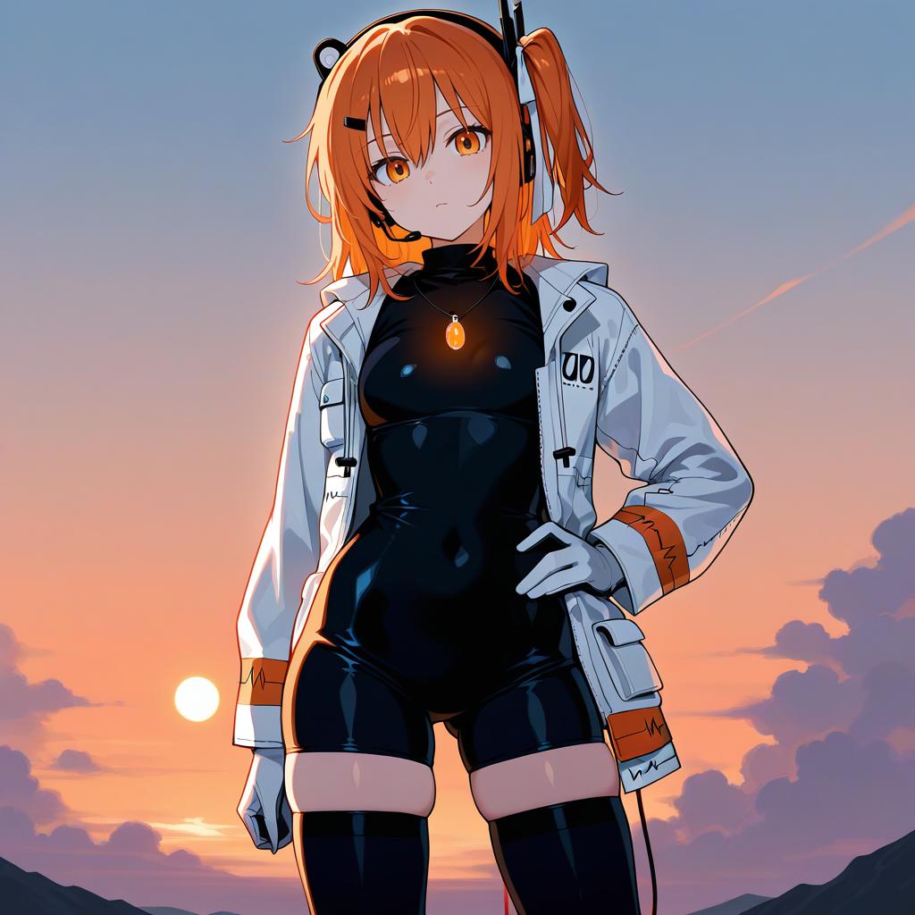 Cowboy shot, adachi rei, 1girl, solo, orange hair, orange eyes, white jacket, black bodysuit, skindentation, medium hair, hairclip, one side up, white gloves, black thighhighs, expressionless, standing, contrapposto, hand on own hip, headset, gradient sunset, glowing pendant, head tilt slightly