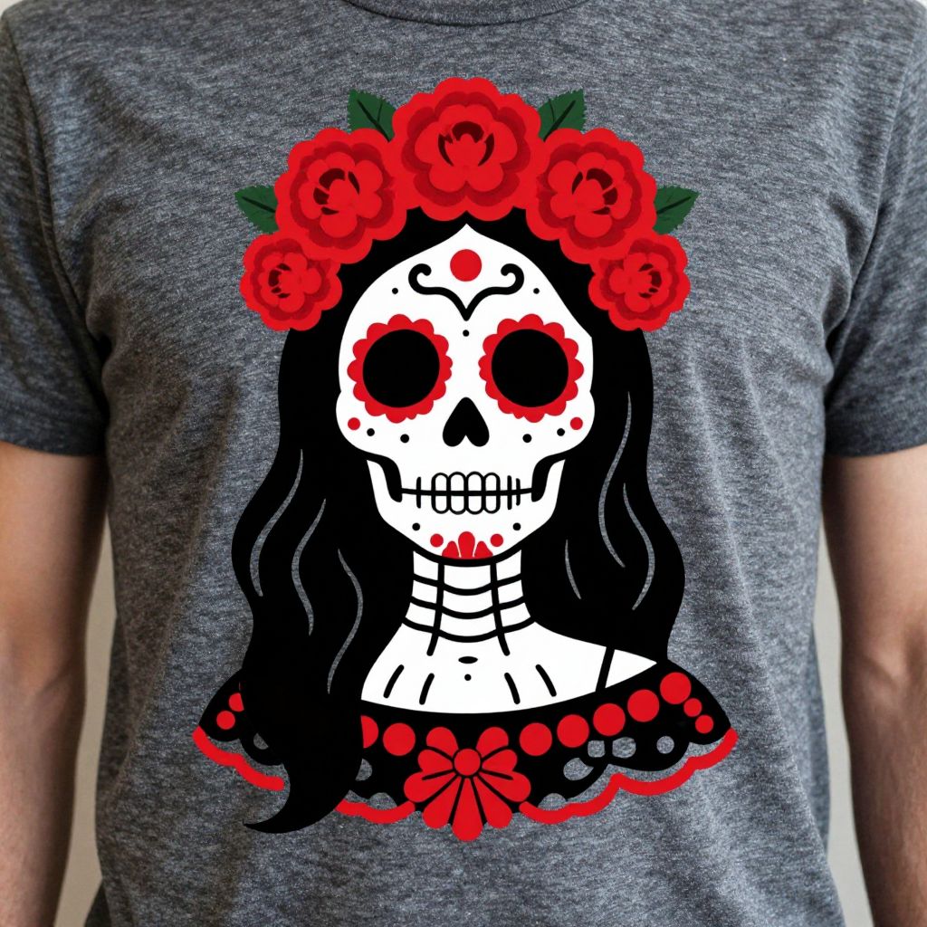Dia de los Muertos Sugar Skull Woman with Red Flowers in Hair Graphic Decal - Ragged Apparel Screen Printing and Signs - www.nmshirts.com