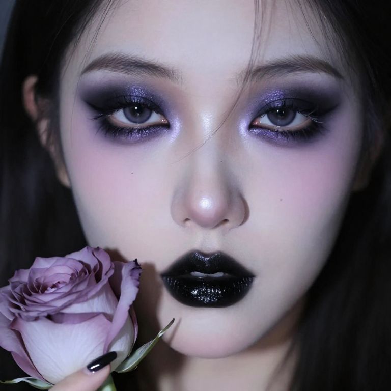 Close-up of Korean goth makeup look with glossy black lipstick, smoky eyeshadow gradient from black to violet, pale skin, dark painted nails holding a delicate rose, moody shadows creating a mysterious vibe, highly detailed, cinematic portrait style.