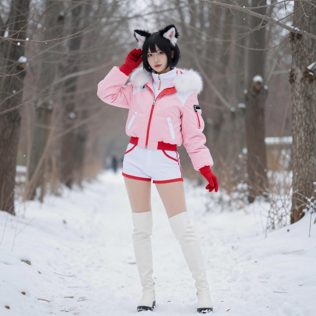 Woman in a winter-themed sexy cosplay outfit featuring a pink and white insulated jacket with fur trim, white short shorts with red trim, thigh-high white boots, red gloves, and a black hair accessory resembling animal ears. The setting is a snowy forest path with bare trees.