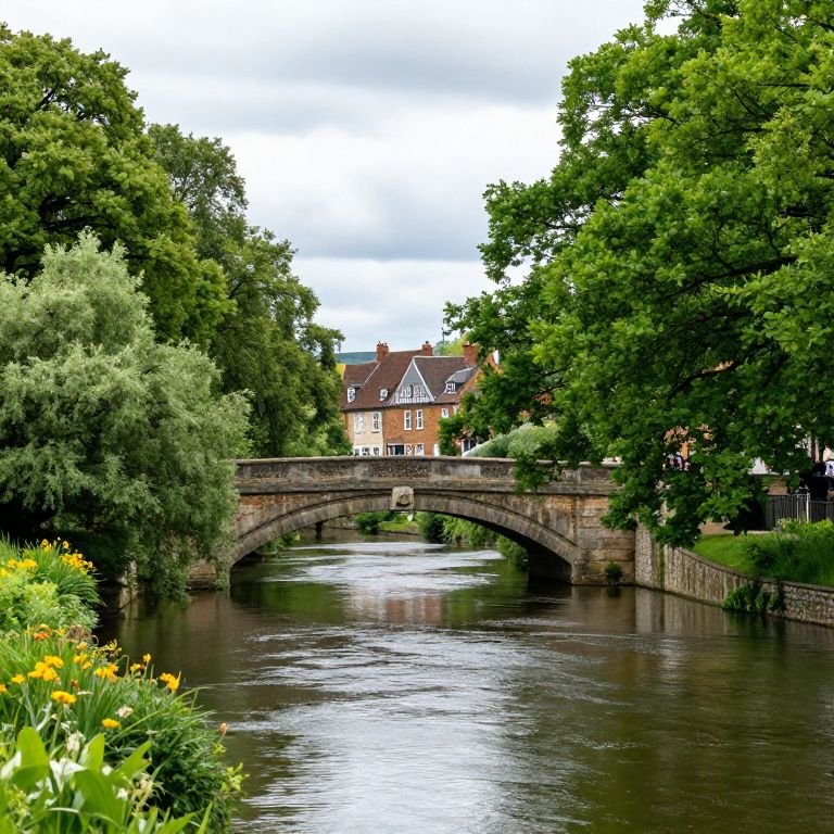 A serene landscape featuring a tranquil river flowing beneath a classic stone bridge, flanked by lush green trees and vibrant vegetation, with a charming brick building visible in the background under a partly cloudy sky.