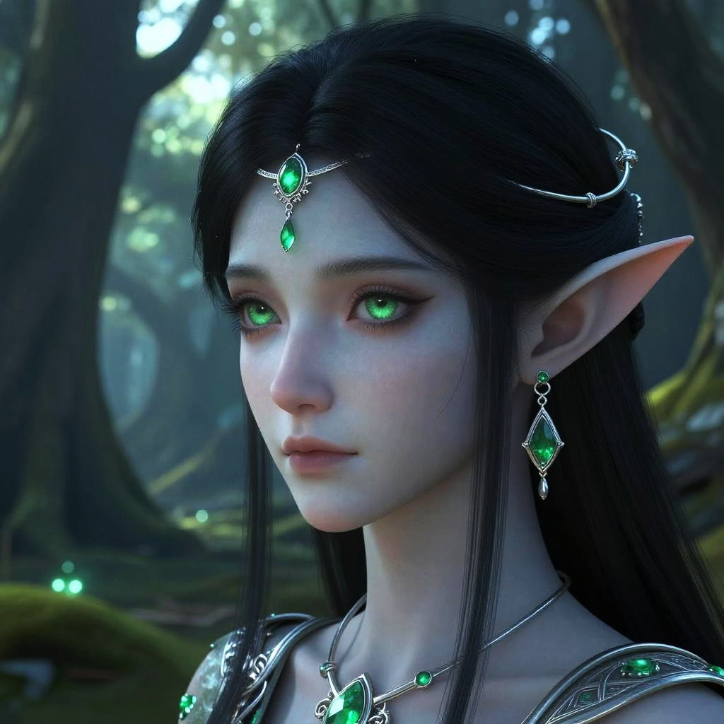 Close-up of pale skin black hair green eyes fantasy elf character, intricate silver jewelry and emerald gemstones, ethereal forest backdrop with glowing light filtering through ancient trees, mystical and serene atmosphere, high fantasy art style.