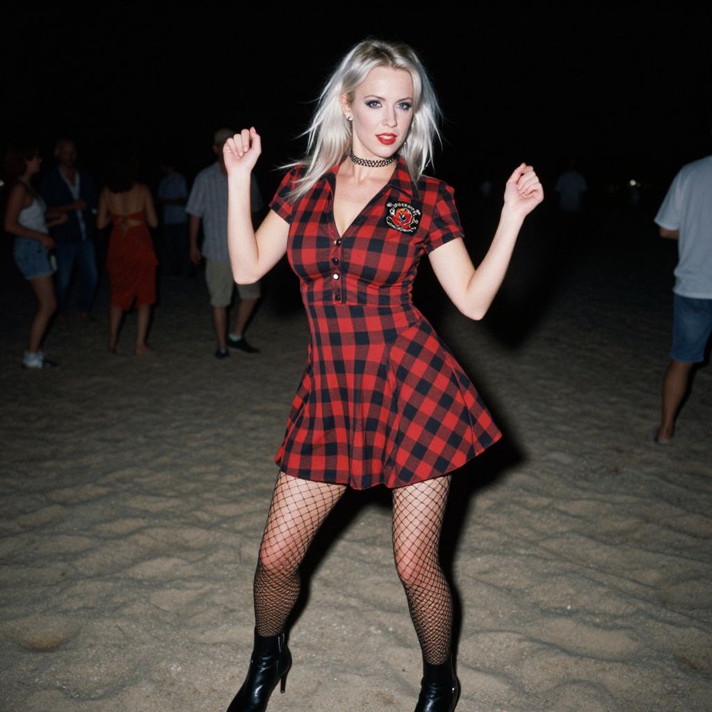 A woman, lomography analog photo, punk-inspired, checkered A-line mini dress in black and red, short sleeves, pointed collar, button-down front, embroidered patch on chest, fishnet stockings, high-heeled ankle boots, choker necklace, platinum blonde hair, Moonlight dance party on the beach, dancing energetically. Sexy. Pretty face and beаutiful eyes. Big breasts