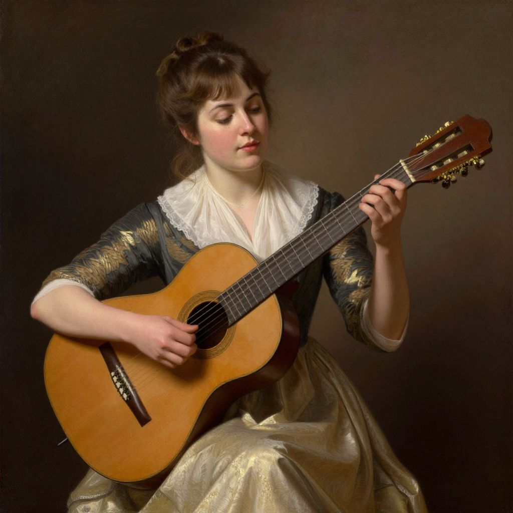 A finely detailed digital artwork inspired by Ferdinand Roybet's style, depicting a woman in mid-19th-century attire gracefully playing a classical guitar, rendered with rich, warm tones and dramatic lighting reminiscent of the era's portraiture.