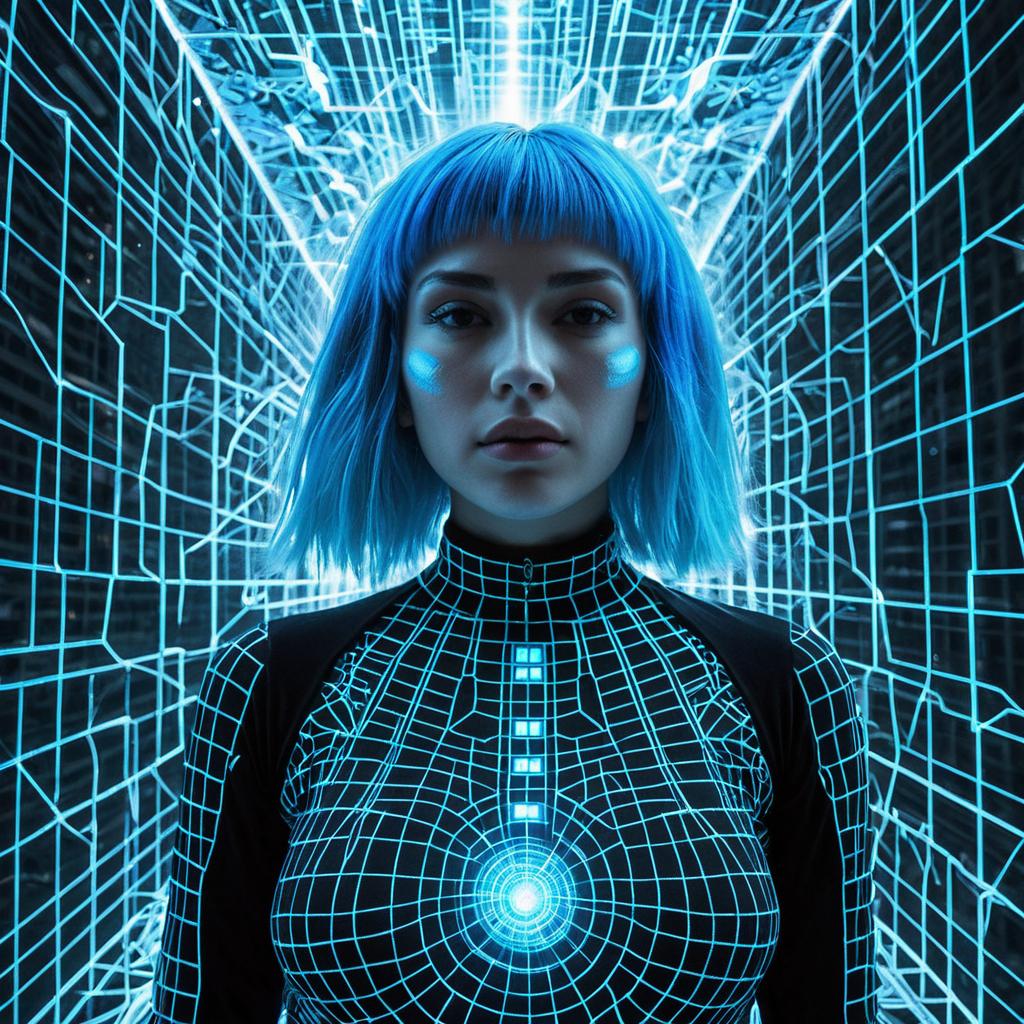 Futuristic portrait of a cybernetic woman with neon blue hair wearing a glowing grid-patterned bodysuit. She stands in a holographic fractal metropolis composed of radiant, translucent grids and electronic light streams, symbolizing digital integration and identity dissolution.