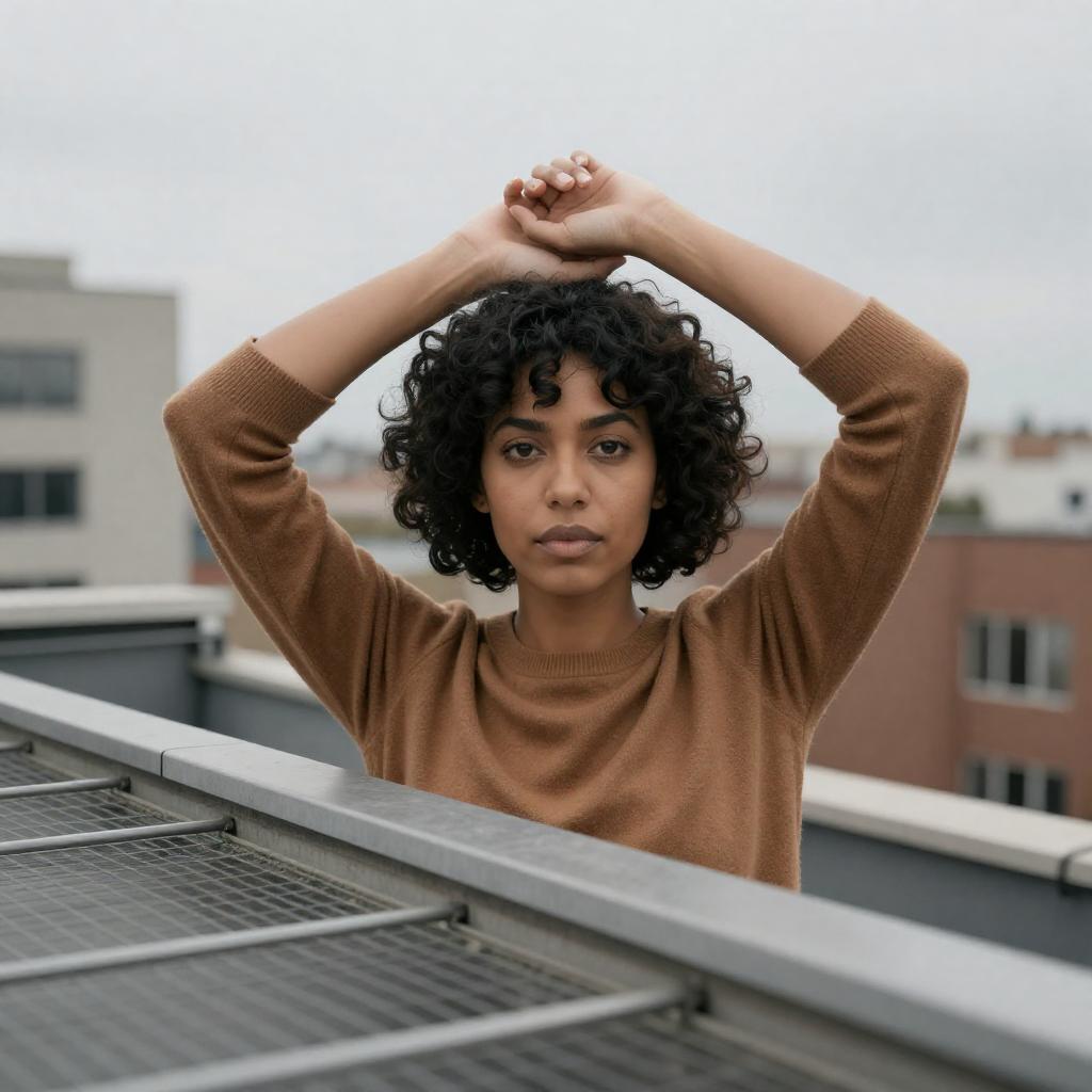 Intense Woman on Rooftop in Cityscape