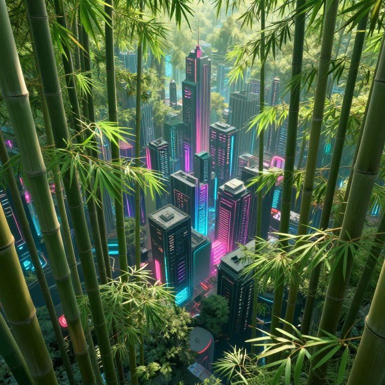 A surreal digital artwork showcasing an enchanting blend between a serene bamboo forest and a lively cyberpunk cityscape. This mesmerizing scene is viewed from an aerial perspective, enabling the viewer to witness the harmonious union of nature and technology. Softly swaying bamboo stalks are gently caressed by a mild breeze while the neon-lit skyscrapers cast an enchanting radiance on their surroundings, creating an extraordinary ambiance that sparks curiosity and fascination. The image is teeming with intricate details, featuring a highly vibrant color palette that accentuates the vivid tones of both the organic and artificial elements in this captivating fusion.