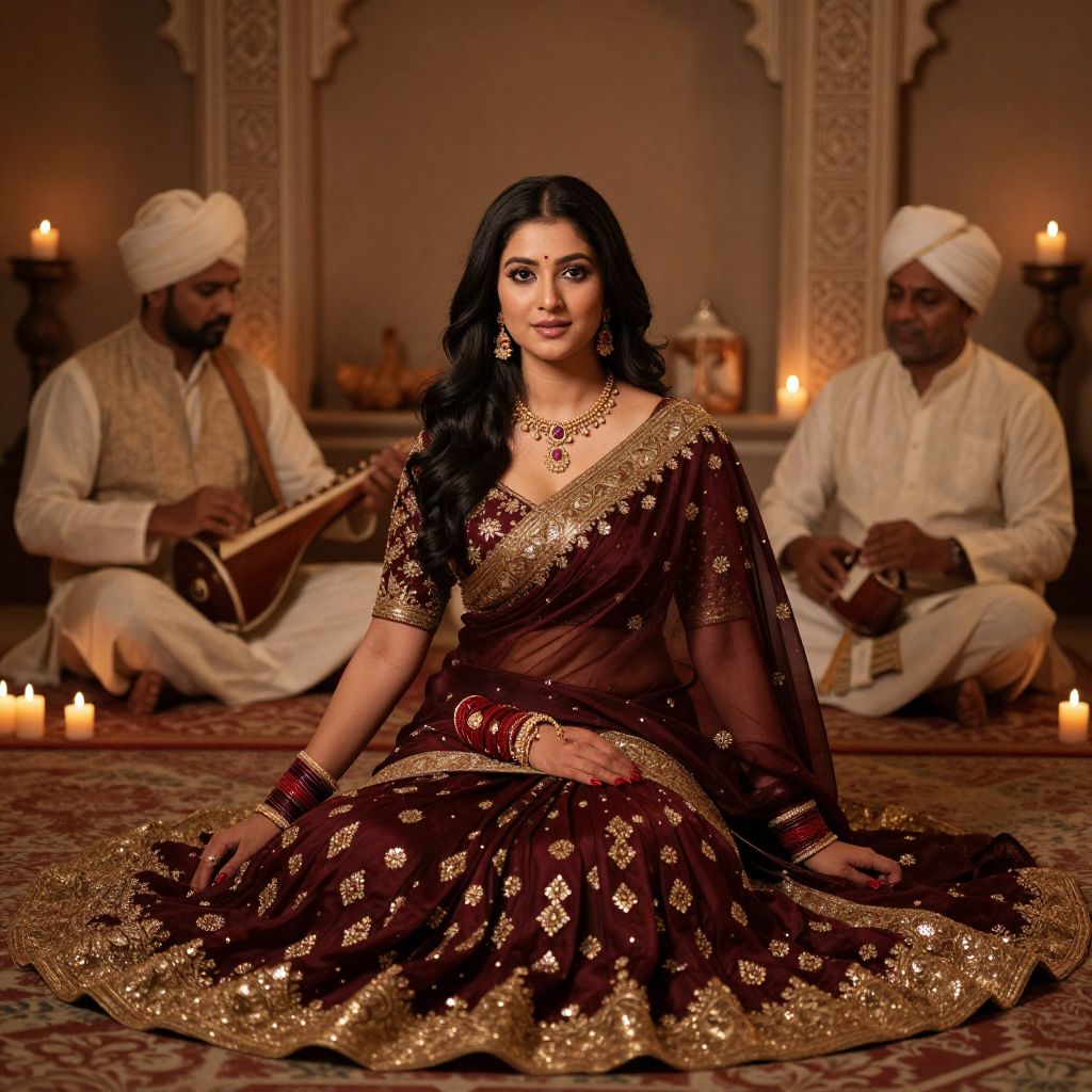 Photograph of a South Asian woman with long, wavy black hair, wearing a rich maroon saree adorned with gold embroidery, seated on a patterned rug in a dimly lit room. She has dark, smoky eye makeup and wears a red bangle and gold necklace. Two men with white turbans, dressed in white traditional attire, sit in the background playing musical instruments, surrounded by lit candles. The room features ornate, classical architectural elements. The overall ambiance is warm and elegant, highlighting traditional Indian cultural elements.
