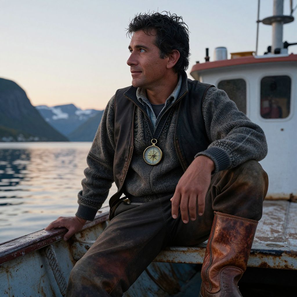Craft a captivating photorealistic portrait of a charismatic Hispanic fisherman with rugged features and piercing blue eyes, captured in profile as he leans against his aged boat during a serene dawn on a fjord. The soft morning light illuminates the texture of his worn leather boots and accentuates the intricate details of his nautical attire, including an antique compass pendant adorning his chest. His expression exudes contentment and reflection, with a subtle smile gracing his lips as he gazes thoughtfully towards the horizon, evoking a sense of tranquility, adventure, and nostalgia.