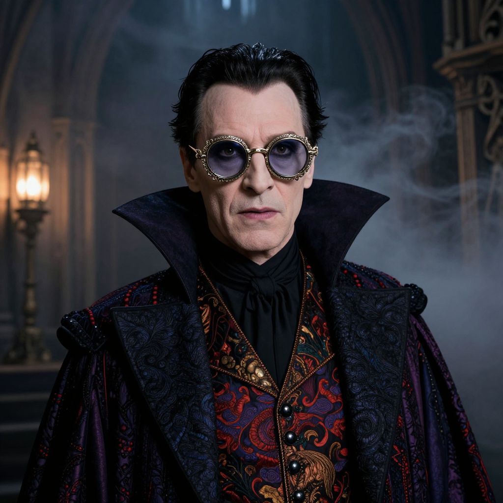 Photograph of a middle-aged man with pale skin and slicked-back black hair, wearing round, gold-framed sunglasses with dark lenses. He has a high-collared, black, ornate cloak with intricate red and gold patterns on the front. The background is a dimly lit, gothic-style cathedral with smoke or mist and a lit lantern on the left. The man's expression is serious, and the lighting casts shadows, enhancing the dramatic, mysterious atmosphere. The overall style suggests a vampire or Gothic character.