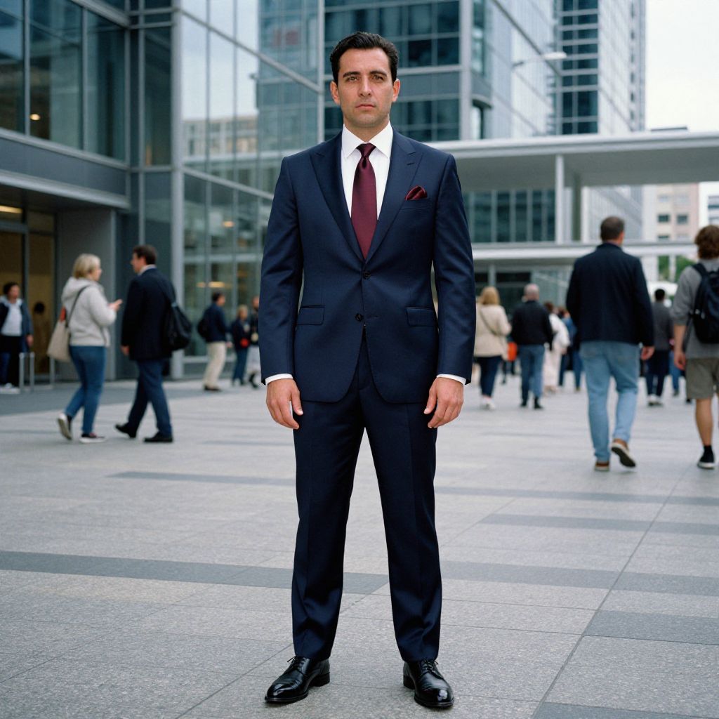 Photograph of a tall, Caucasian man with short, dark brown hair, standing in a busy urban plaza. He wears a dark navy blue, well-fitted suit with a white dress shirt and a maroon tie, complemented by black polished dress shoes. A red pocket square peeks from his breast pocket. The background features modern glass buildings with people walking, some in business attire, others in casual clothing. The plaza is paved with light gray tiles, and the image is brightly lit, suggesting daytime. The man stands centered, looking directly at the camera with a neutral expression.