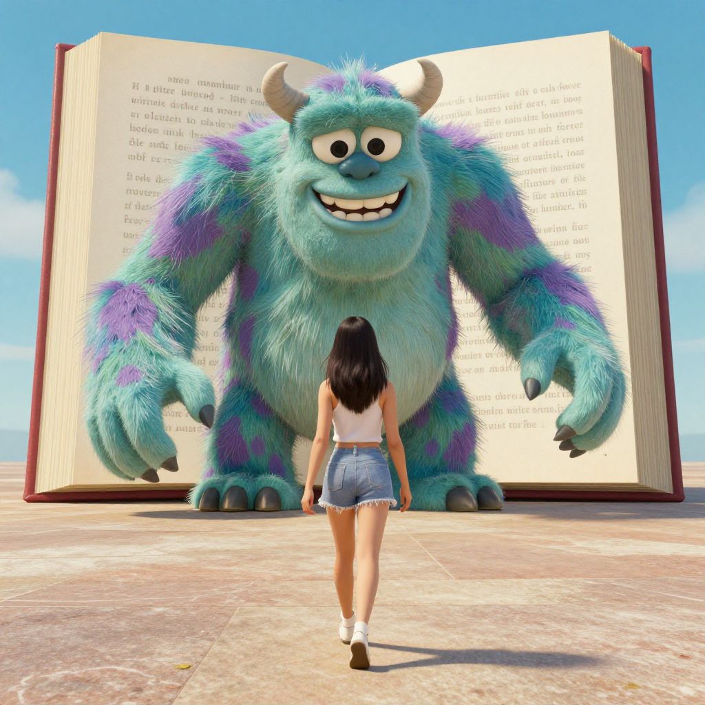 Retro Prints a beautiful Asian woman walk away from a giant book monster, the monster is trying to grab her back, she is walking away, ultra wide, hyper realistic, pixar style,