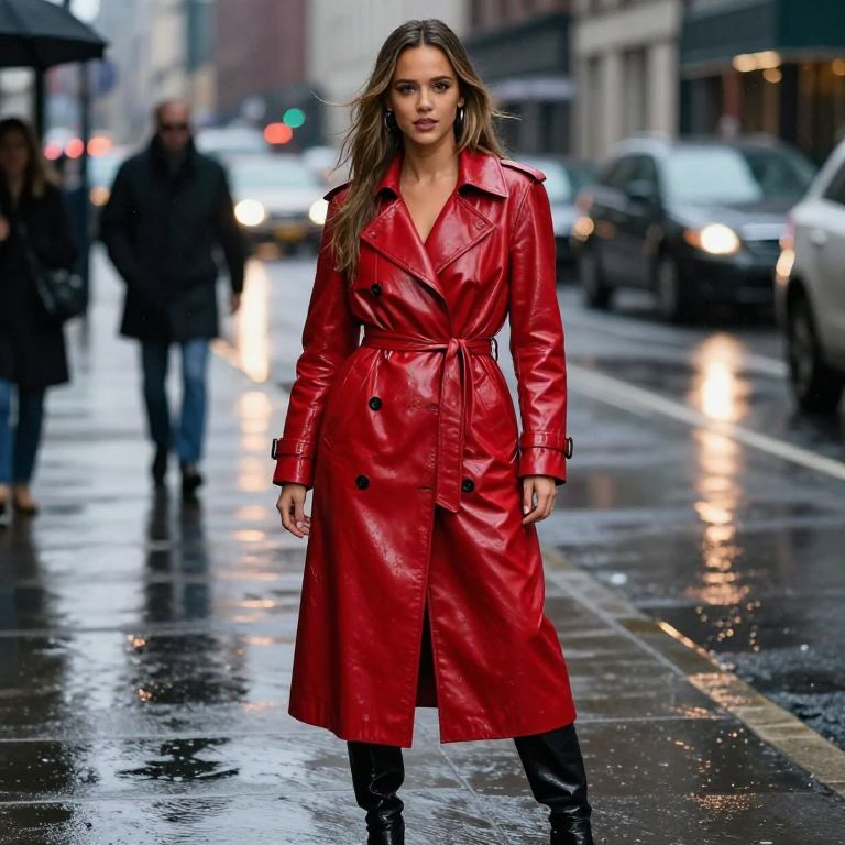Jessica Alba wearing a glossy red leather trench coat in rainy city streets, reflections on wet pavement, dramatic moody ambiance, intense gaze and confident posture, high fashion editorial vibe with cinematic wet texture effects emphasizing the vibrant leather