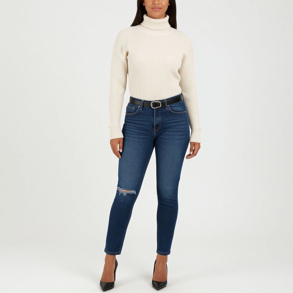 Portrait of a young woman with medium skin tone and dark hair wearing a cream ribbed turtleneck sweater with long sleeves and dark blue high-waisted skinny jeans featuring knee distressing. She accessorizes with a classic black belt with a silver buckle and black pointed-toe high heels. The background is plain white, highlighting her casual yet stylish outfit.