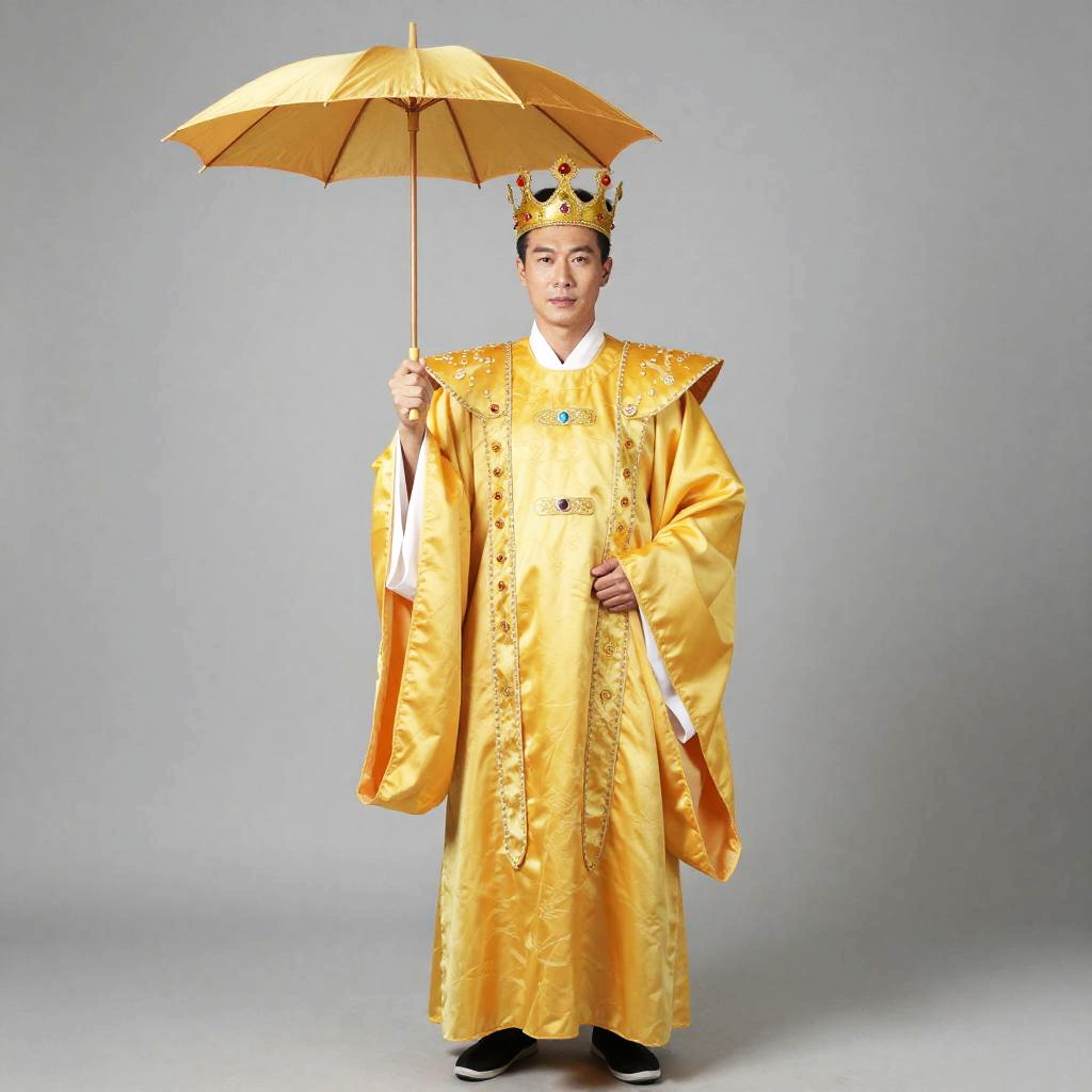 Yellow King Costume, man in a yellow robe and a crown with an umbrella