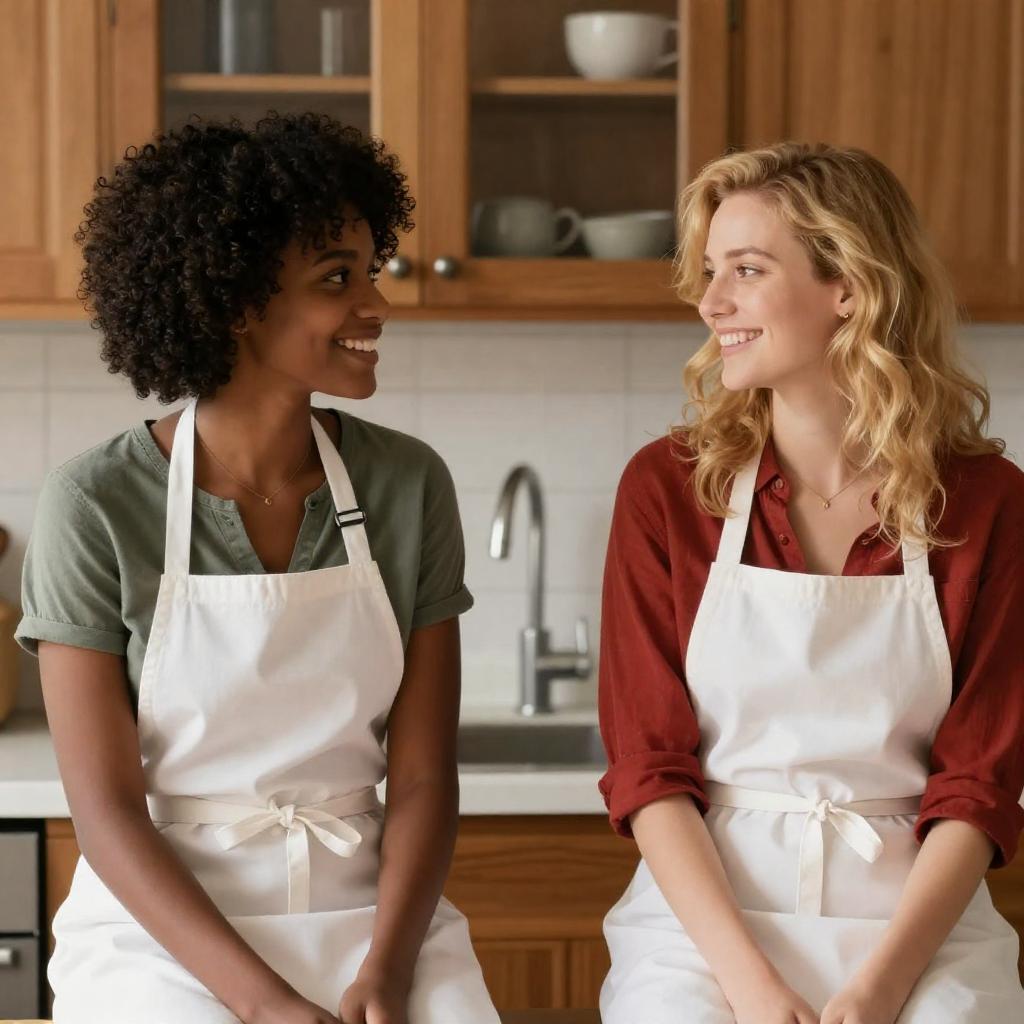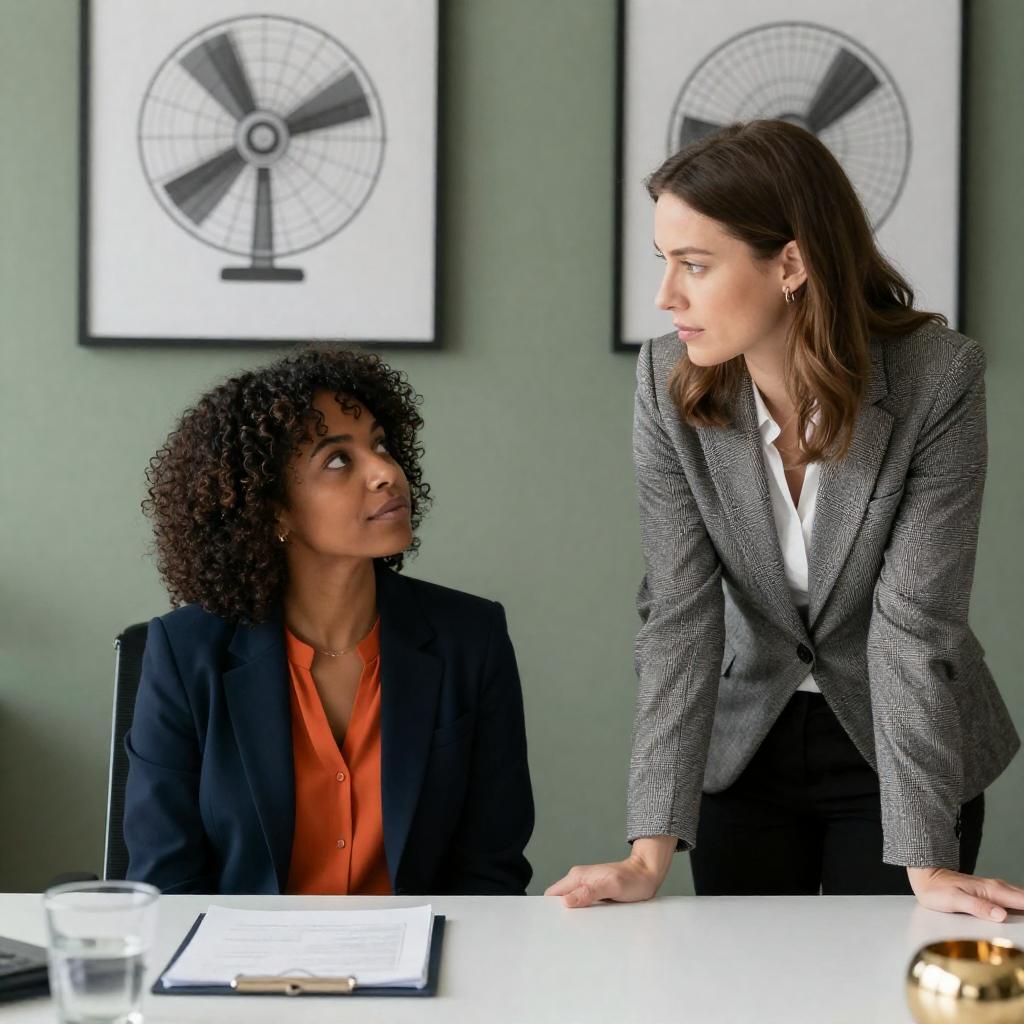Photograph of two women in an airplane cabin. The woman on the left has dark curly hair, white blouse, yellow vest, and orange scarf, holding a magazine. The woman on the right has blonde curly hair, yellow and blue striped shirt, and is gesturing with her hands. Both women have intense expressions, looking at each other. Background includes blurred passengers and airplane windows.