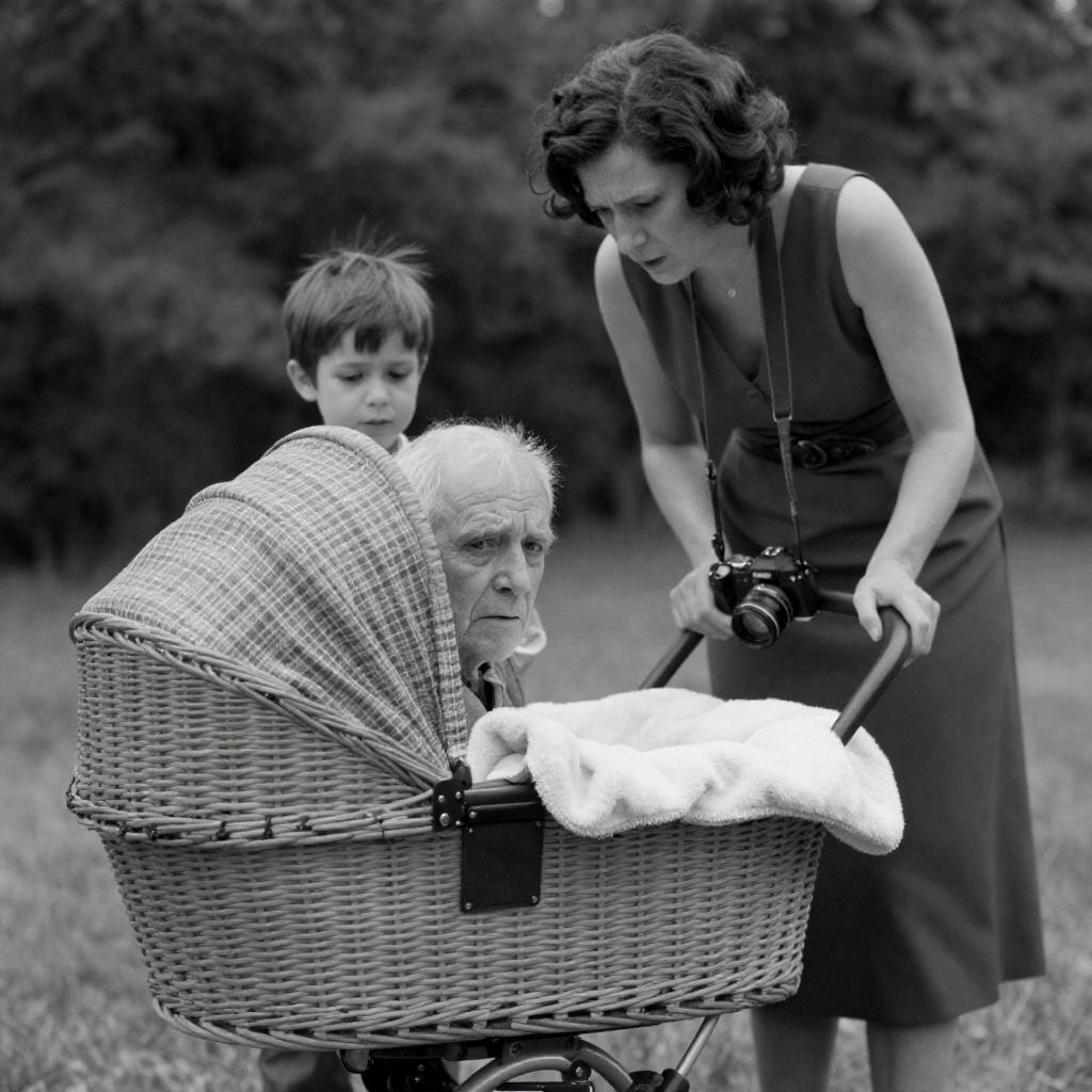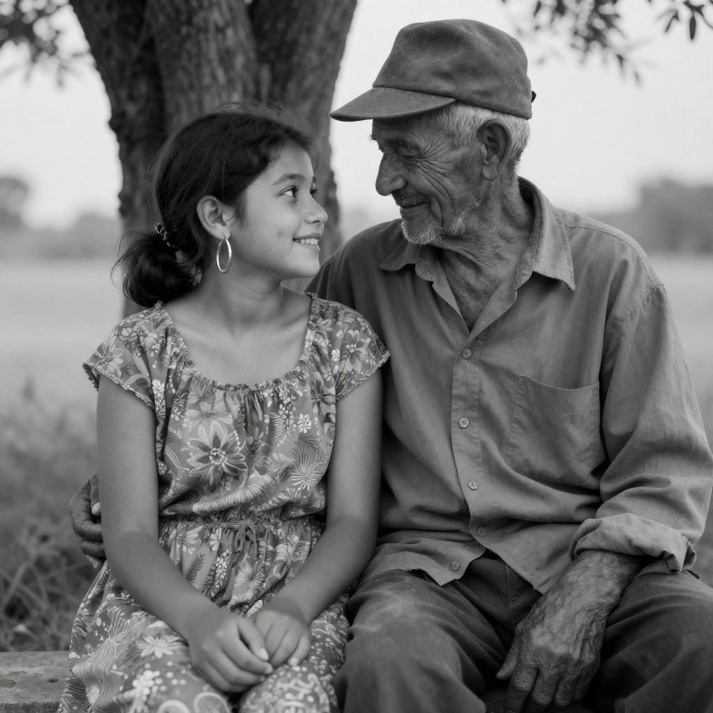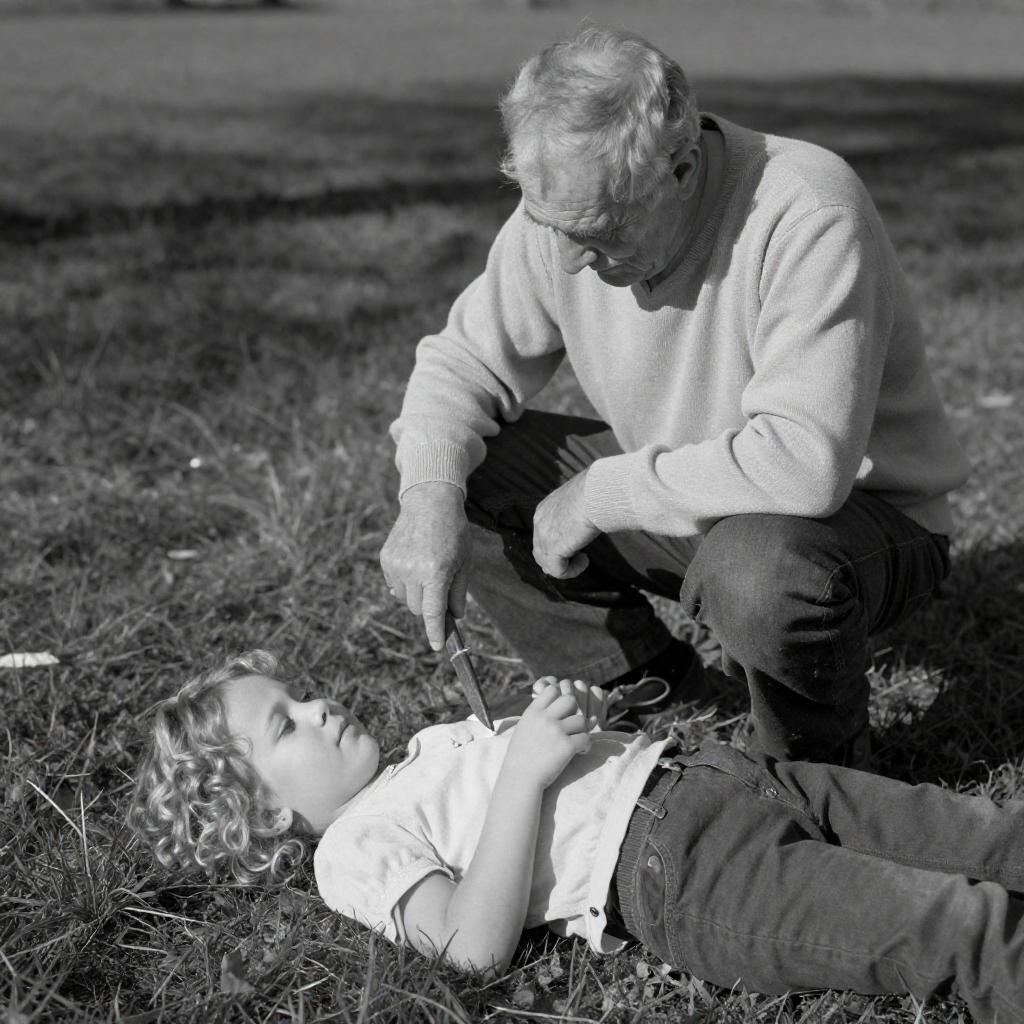 Black and white photograph. Older man with short gray hair, squatting, wearing a light sweater and dark pants, looking down at a young girl with curly blonde hair, lying on the ground, wearing a light top and dark pants. Grass field in background, man holding a small tool. Young girl looking up at man with a neutral expression. Sunlight casting shadows.