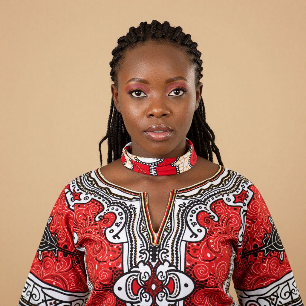 A woman with braids in her hair is wearing a traditional African dress with a red and white patterned scarf around her neck.