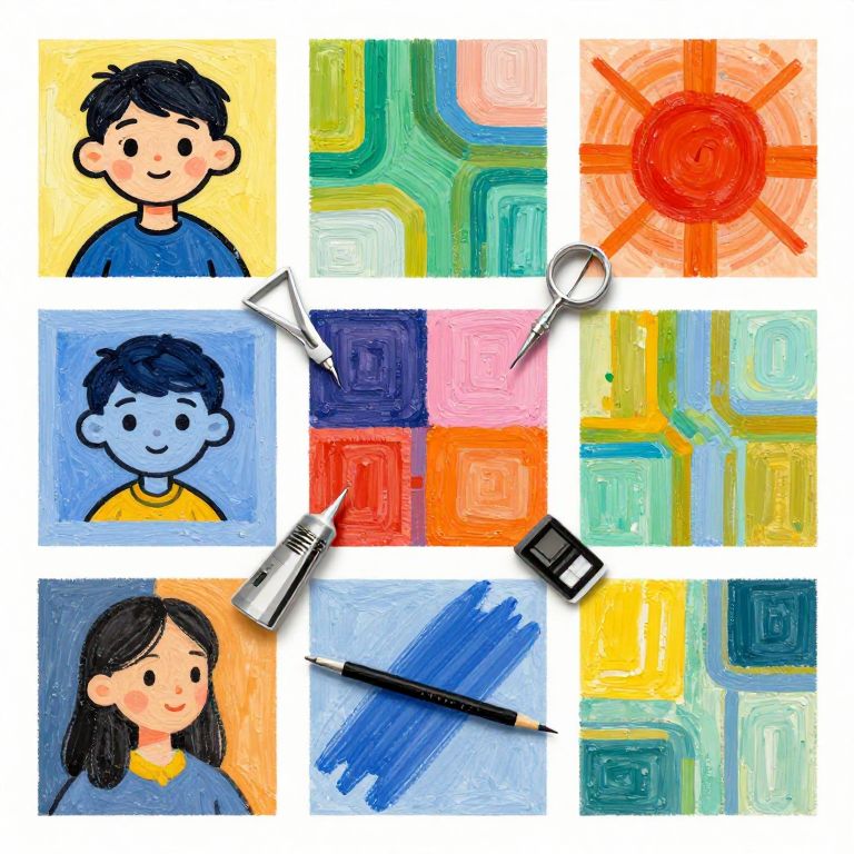 How to stylize art exploration, a dynamic collage of different art styles side by side with annotations, creative tools scattered around, colorful abstract backgrounds, showcasing techniques like cartoonish simplification, textured brush strokes, and vibrant color schemes