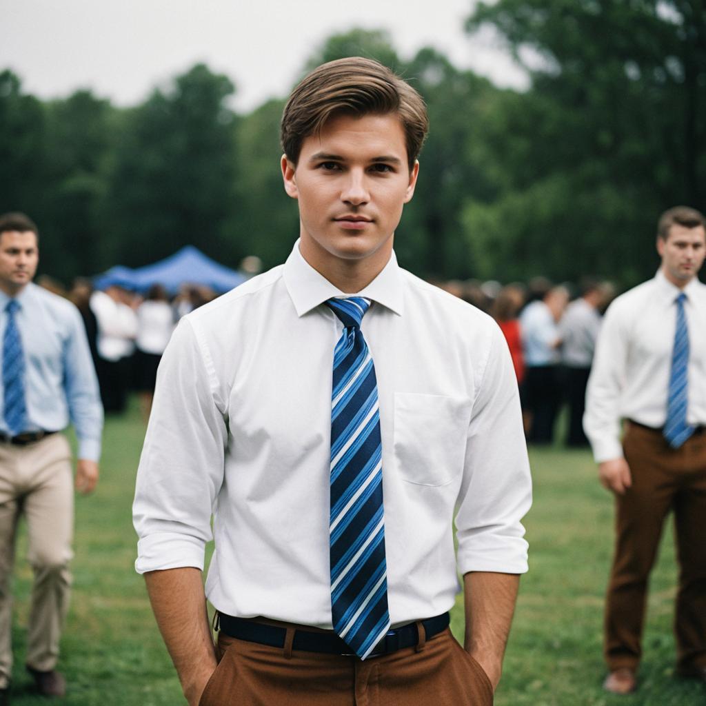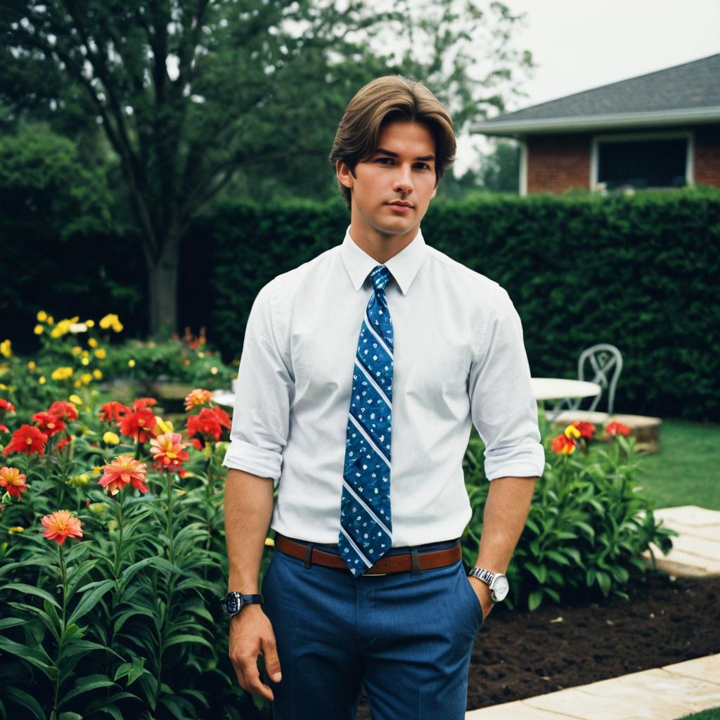 Young adult man with light brown hair wearing a white dress shirt with sleeves rolled up, blue patterned necktie, blue pants, and two wristwatches, standing outdoors in a garden with vibrant red and yellow flowers and green foliage. Background includes a suburban house and outdoor furniture.