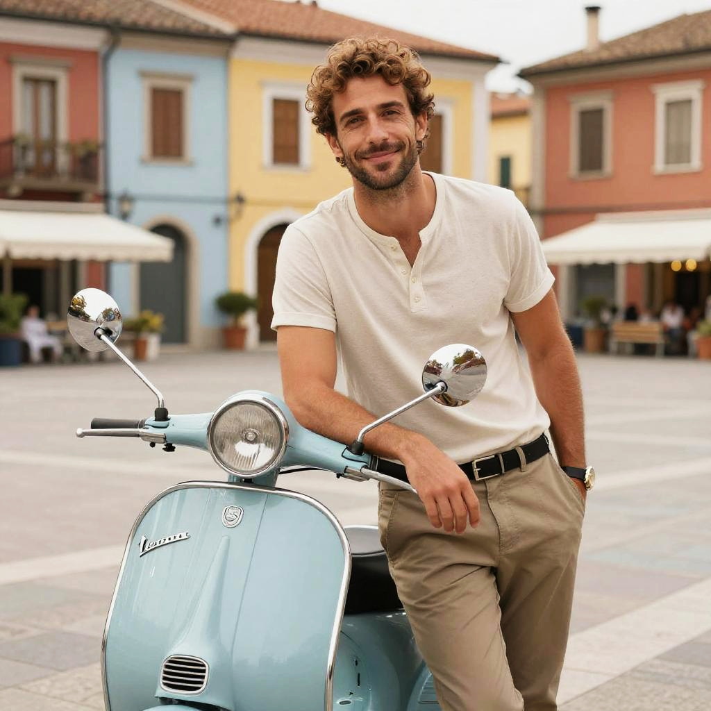Attractive Italian man smiling gently, wearing casual stylish clothing, leaning against a vintage Vespa scooter near a vibrant piazza with colorful buildings, soft natural light, photorealistic