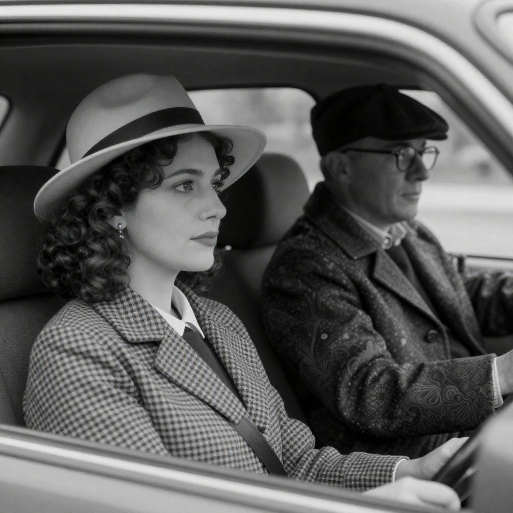 Black-and-white photograph of a young woman and a man sitting in a car. The woman has curly hair, wears a wide-brimmed hat and a checkered coat, while the man wears glasses, a flat cap, and a patterned coat. Both are looking forward as the man drives.