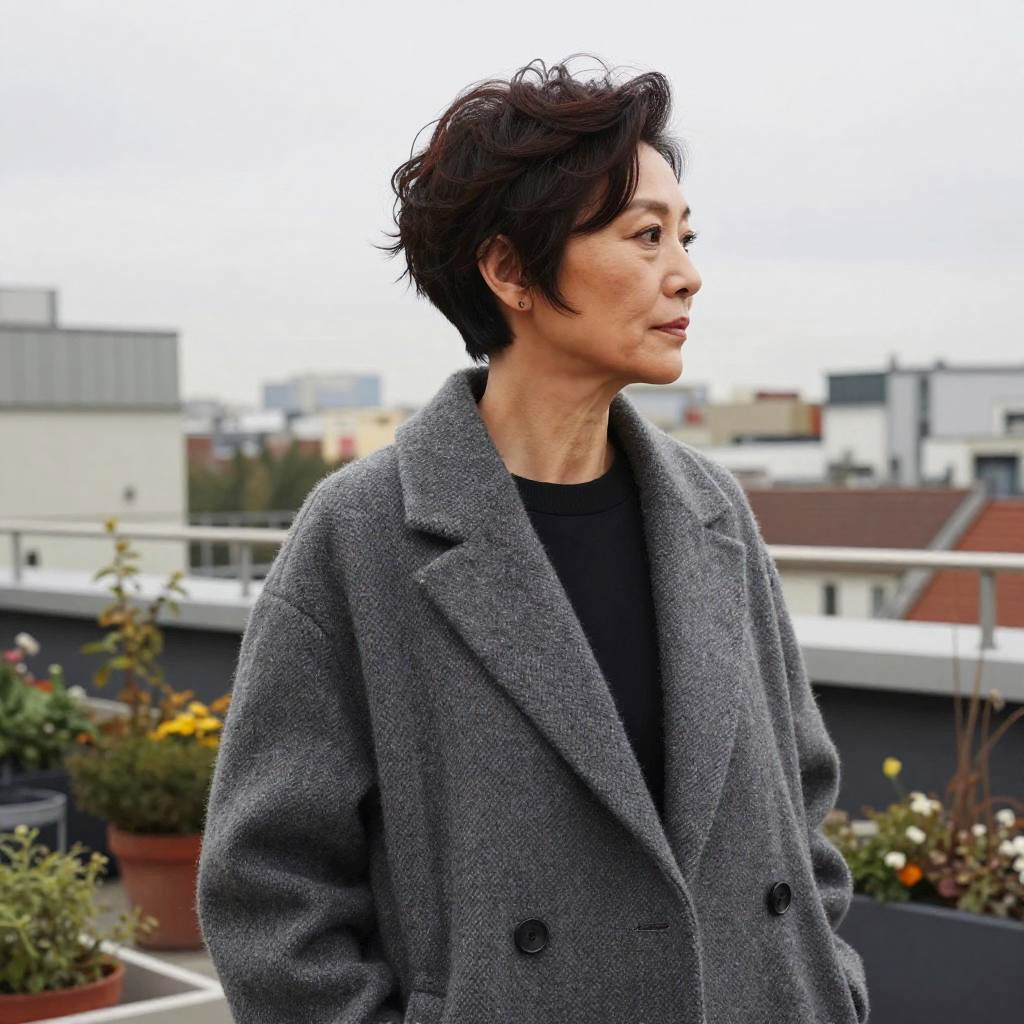 Textured Crop hairstyle on middle-aged woman, wearing structured wool coat, in urban rooftop garden, captured in fashion editorial style with overcast diffused light.
