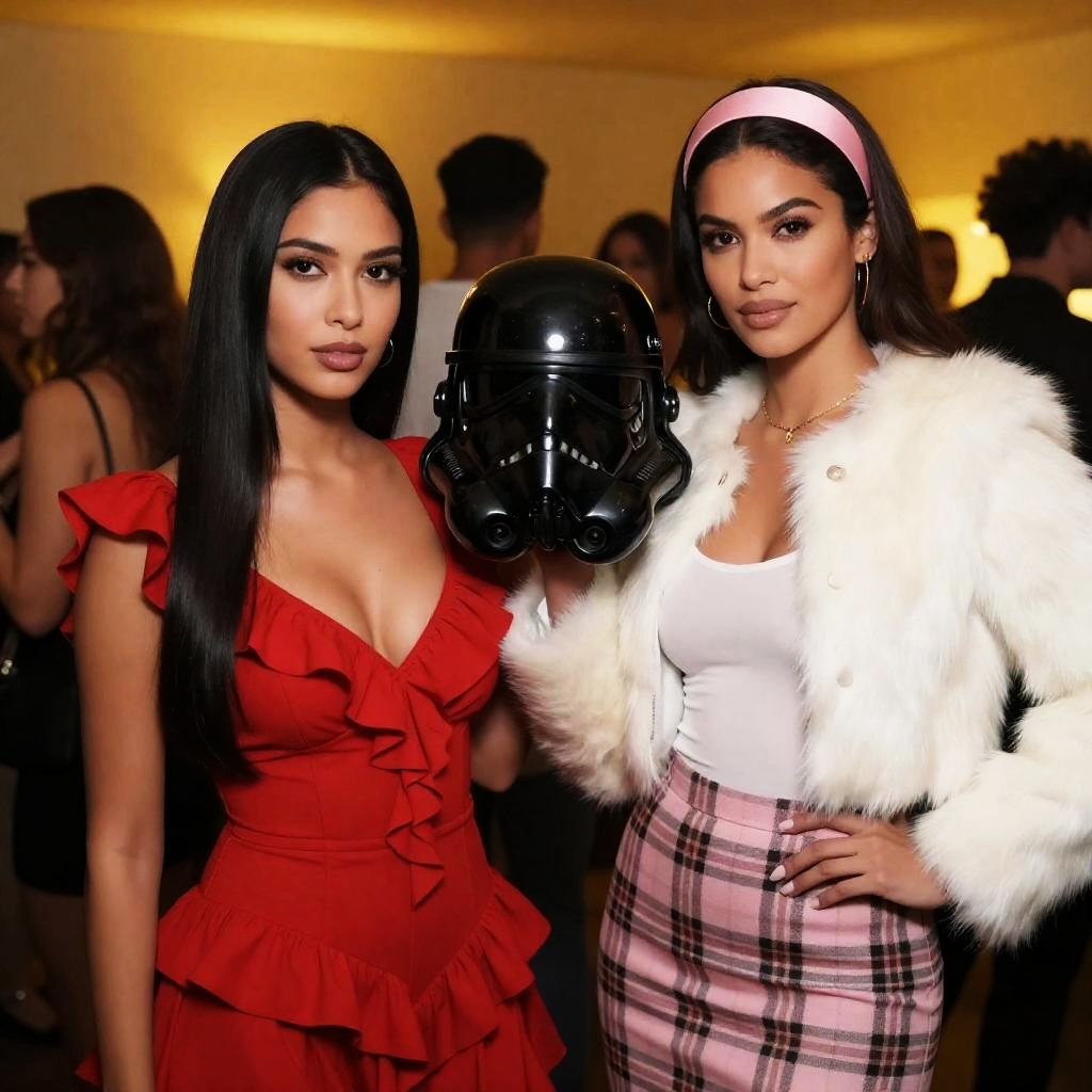 Photograph of two fashionable women at a party. The woman on the left has long black hair and wears a red, ruffled dress with a deep neckline and neutral expression. The woman on the right has long brown hair, wears a white fur jacket, white sheer top, pink plaid skirt, and a pink headband, posing confidently with hands on hips. They hold a black, shiny Stormtrooper helmet from Star Wars between them. The background features softly yellow-lit walls and other partygoers in semi-formal attire.