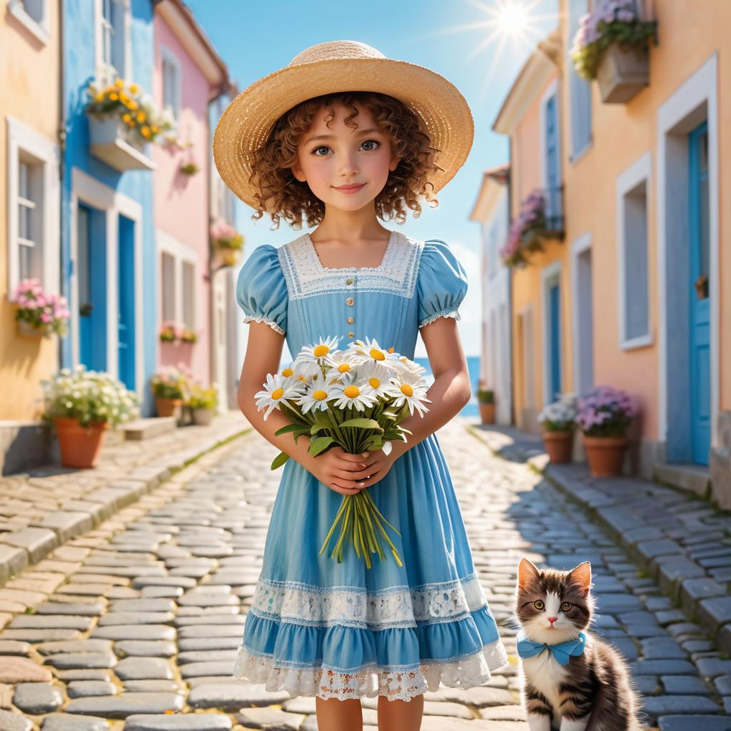 A young curly-haired girl in a vintage lace-trimmed blue dress and a wide-brimmed straw hat, holding a large bouquet of daisies, standing on a sunlit cobblestone street near the sea, with a small fluffy kitten by her side. The background shows softly blurred pastel-colored buildings and bright blue sky, warm natural lighting with a gentle nostalgic and romantic atmosphere.