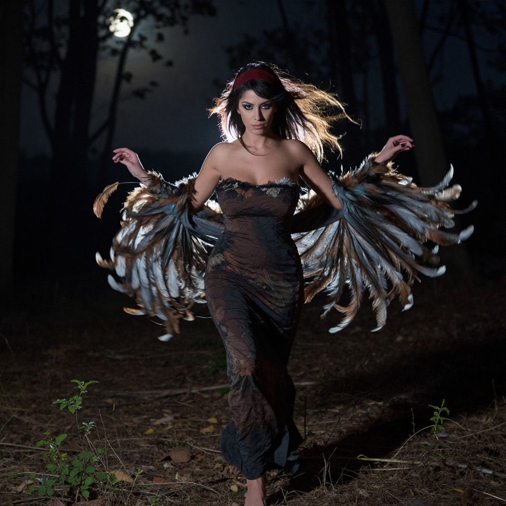 A mysterious woman in a feather sleeve gown walks through an abandoned forest at night, her arms moving with theatrical flair, feathers catching the moonlight, her face half in shadow with sharp, angular features, intense dark eyes, wearing a crimson headband, the wind sweeping through the leaves and causing her sleeves to flare open dramatically. The woman has big tits and cute face