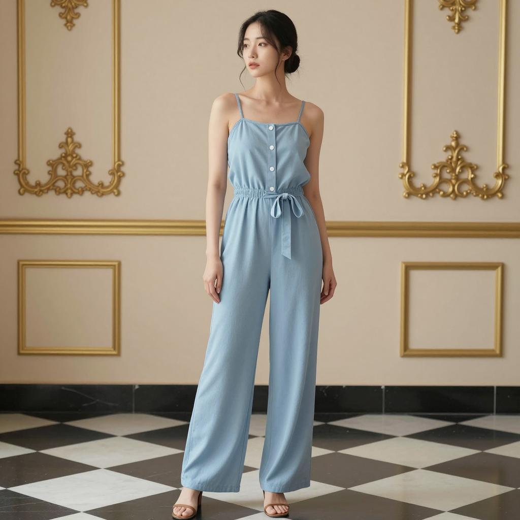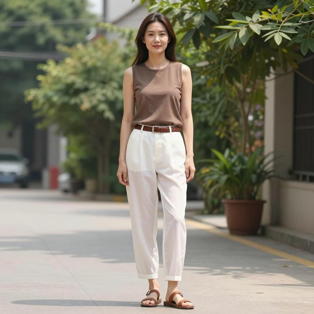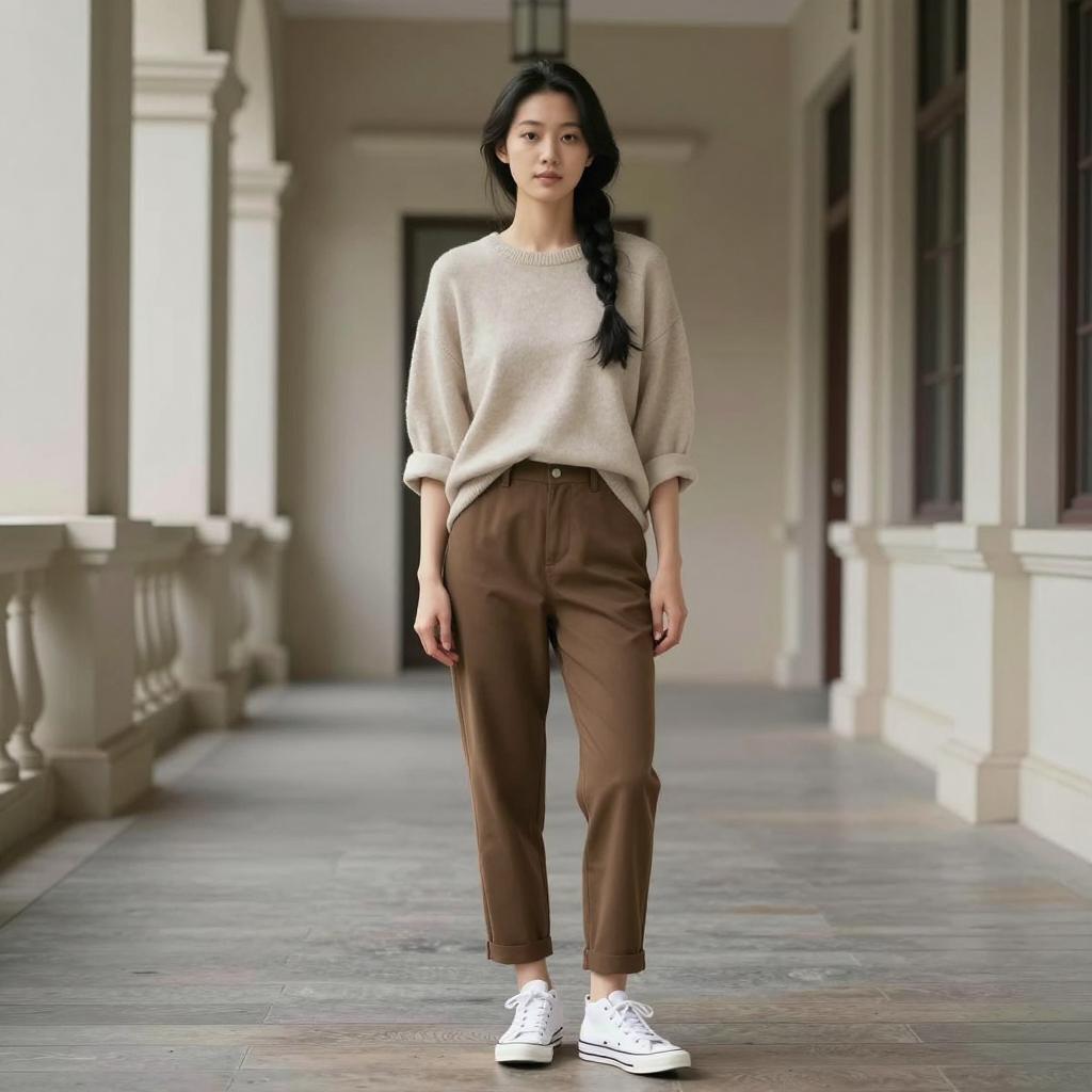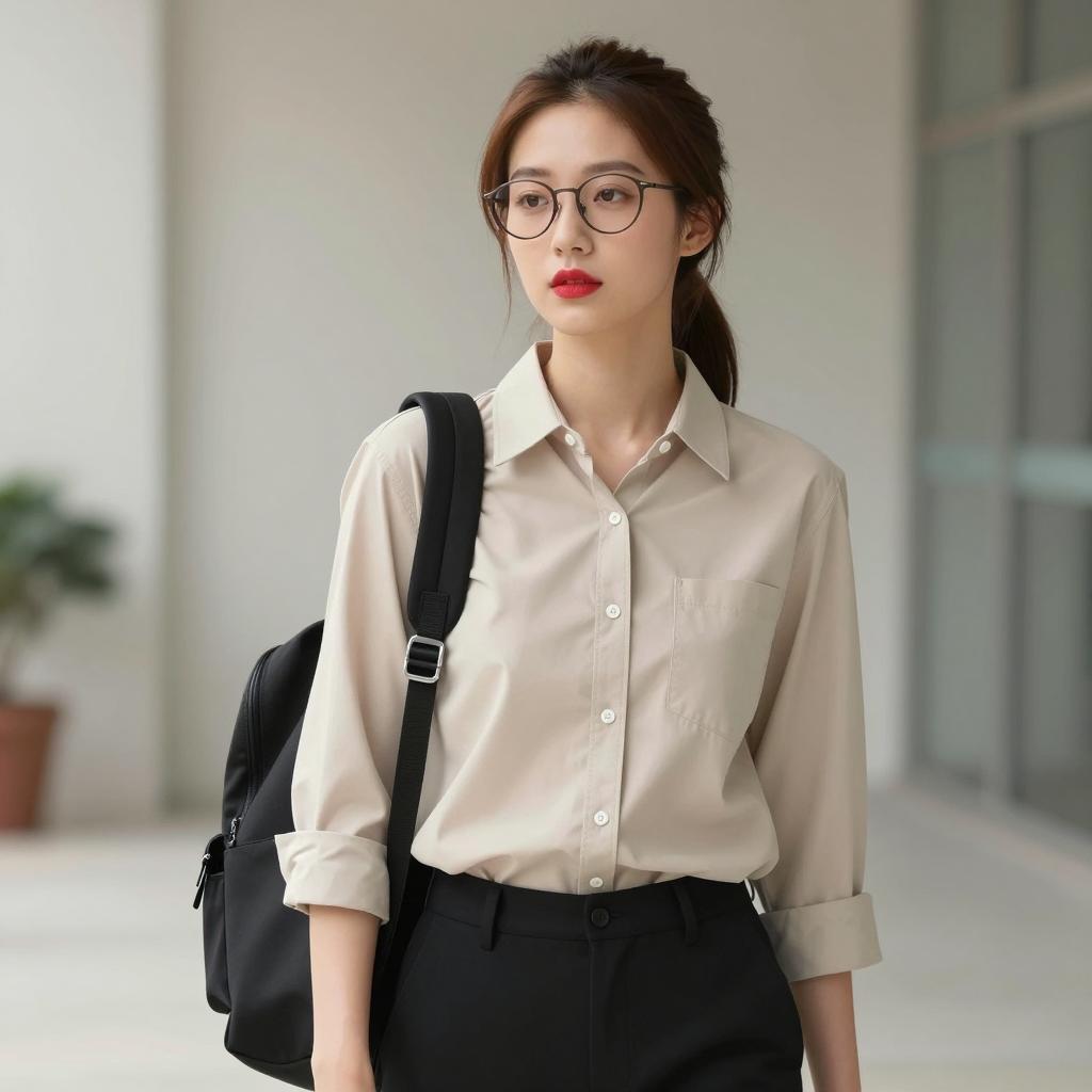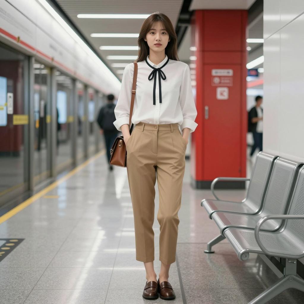 Woman lady waiting costume, photograph of a young Asian woman standing in a modern subway station, white blouse with black ribbon tie, tan cropped pants, brown loafers, brown shoulder bag, brown hair, straight, looking at camera, hands in pockets, metal bench to the right, red emergency exit sign in background, overhead lights, slightly blurred background, daytime, casual attire, natural light, realistic style, urban setting, standing pose