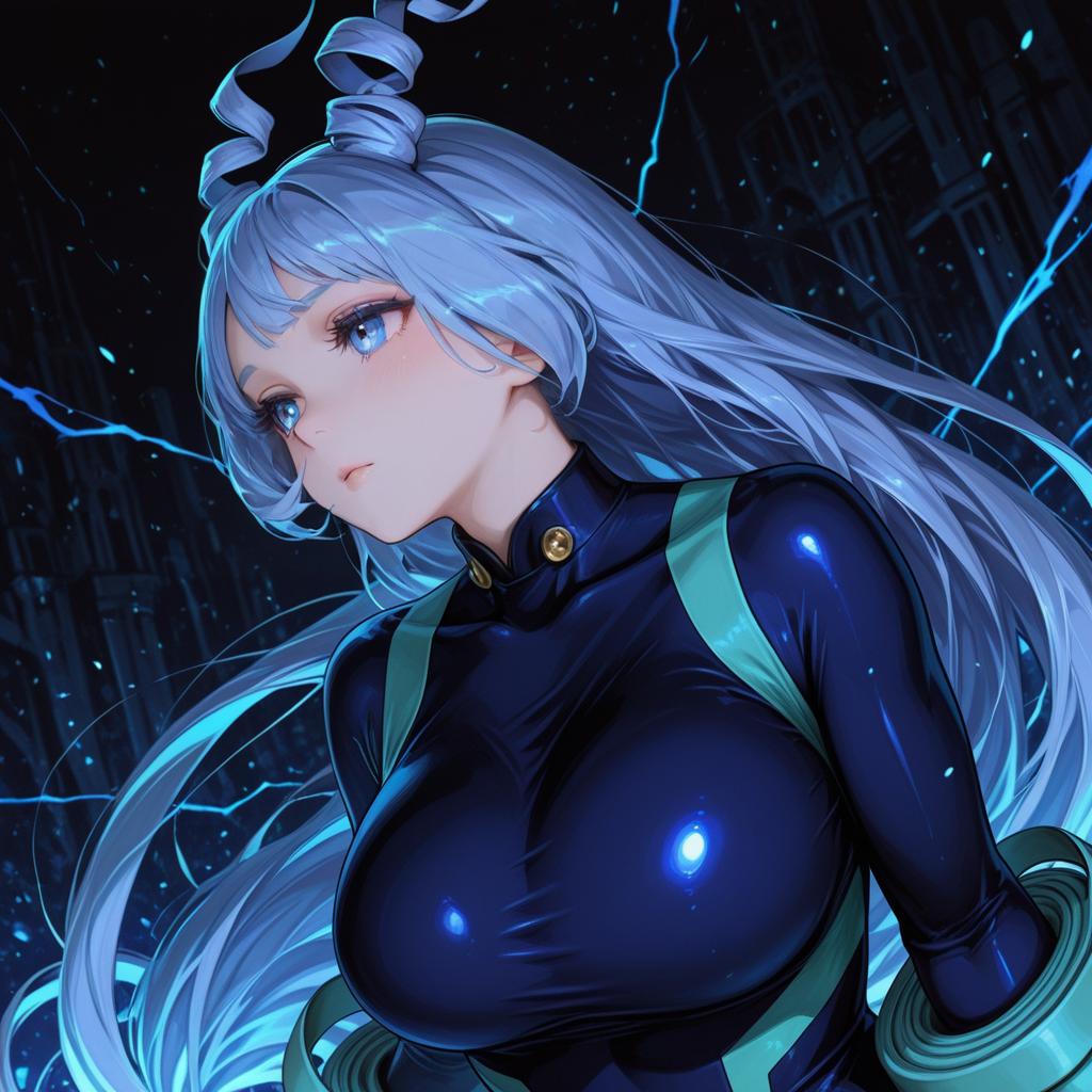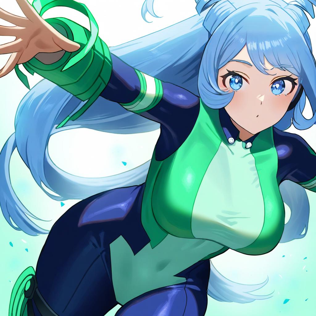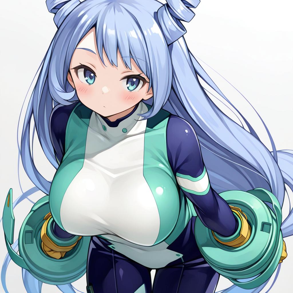 Hadou nejire, boku no hero academia, 1girl, hair horns, blue eyes, very long hair, blue hair, light blue hair, large breasts, superhero costume, twin drills, by artist akasaai, dark_illustrious