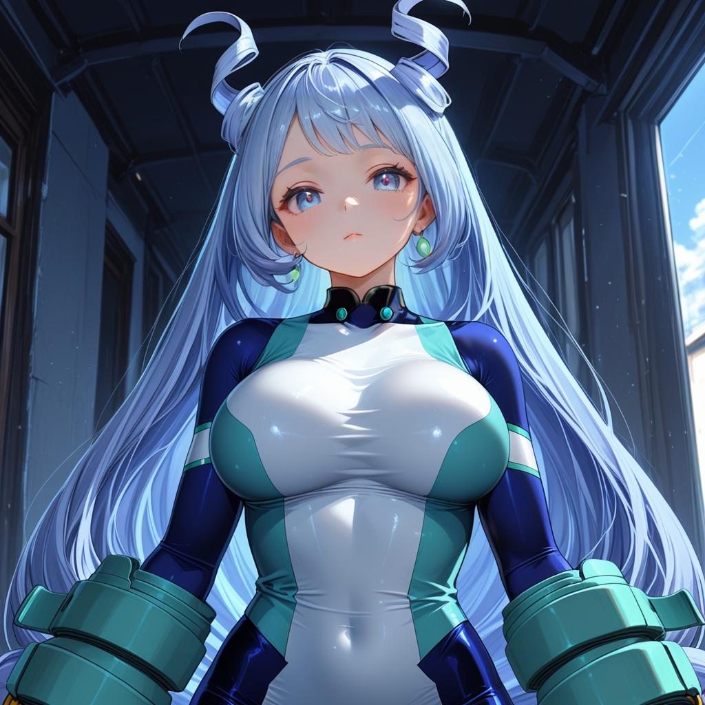 Digital anime-style illustration of a female superhero with very long light blue hair styled in twin drills resembling horns. She has heterochromatic blue eyes and wears a form-fitting blue and white superhero costume with futuristic wrist guards. The background shows a dark corridor with a window revealing a blue sky. The art style is detailed and vibrant.