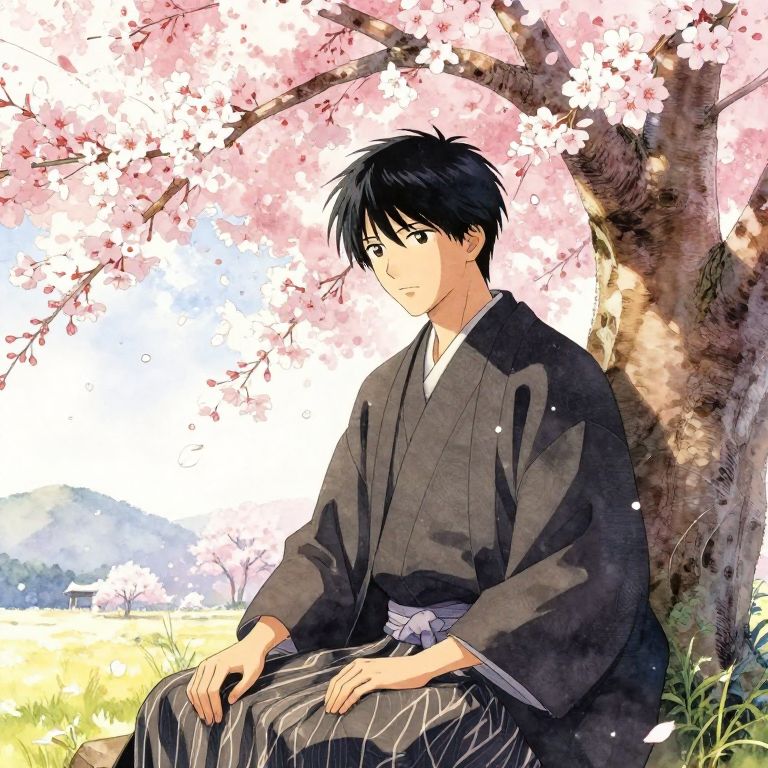 Black hair anime dude sitting under cherry blossom trees in full bloom, traditional Japanese kimono, serene expression, soft petals falling around him, gentle sunlight filtering through branches, delicate watercolor style with vibrant colors and intricate background details.