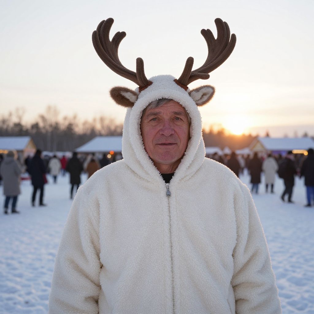 Photograph of an elderly man in a white, fluffy reindeer onesie with antlers, standing in a snowy outdoor festival at sunset, surrounded by