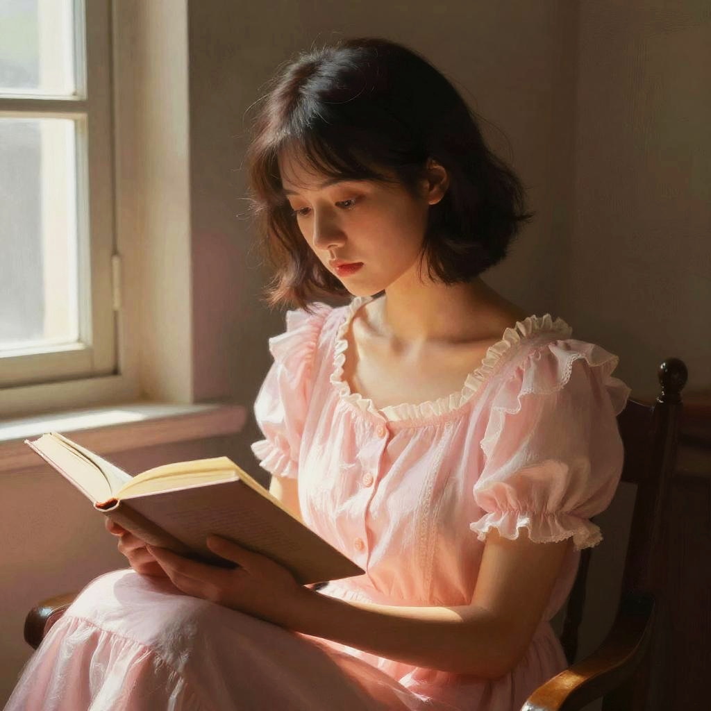 Photograph of an Asian woman with long, wavy black hair lying on a beige surface, reading a pink book with white pages. She wears a light blue, off-shoulder dress with puffed sleeves. Her expression is calm and focused, with slightly parted red lips. The background is a simple, solid beige color, making her the central focus. The image has a soft, slightly textured look, with warm lighting enhancing the gentle, serene atmosphere.