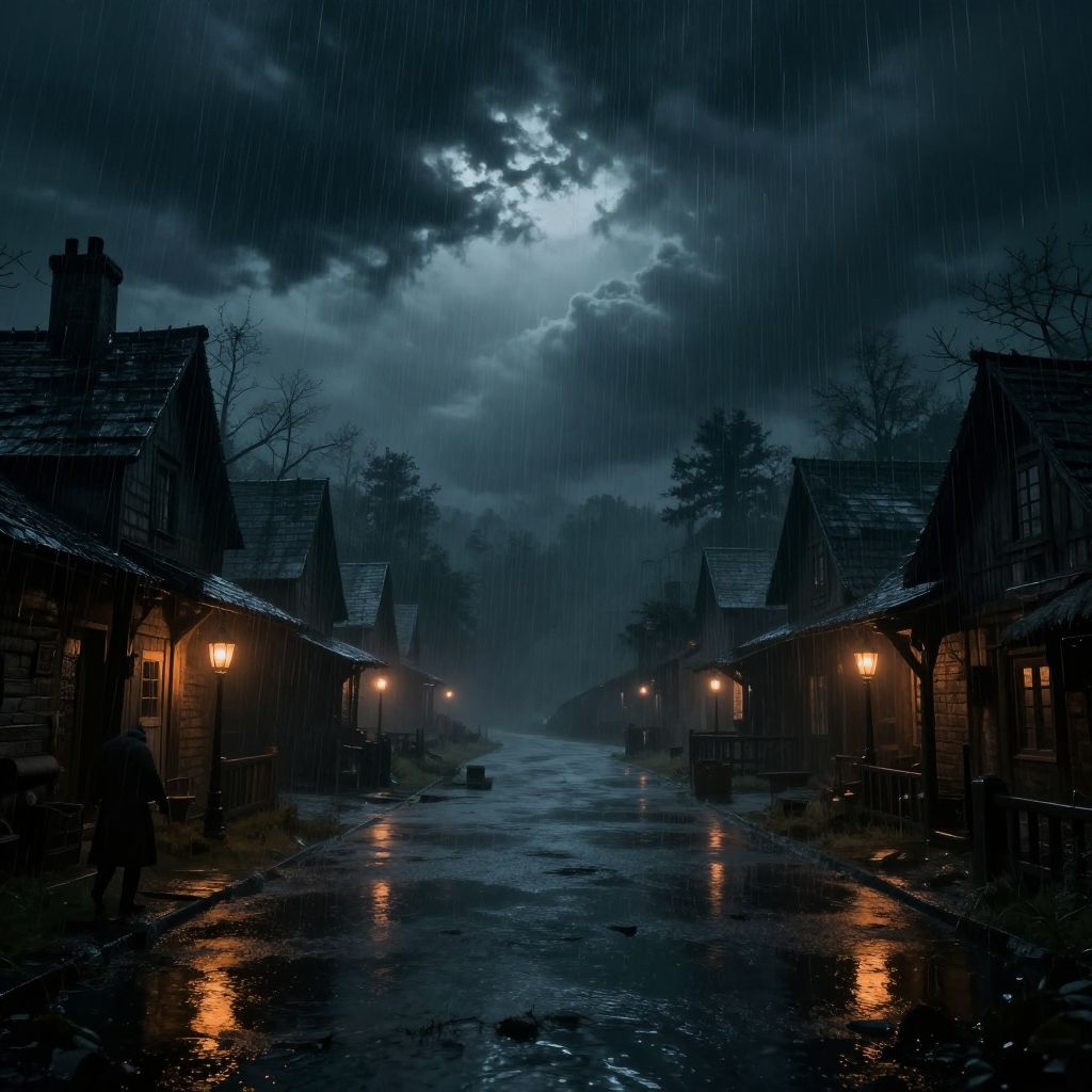 Photograph-style digital artwork of a rainy, cobblestone street in a medieval village with gothic architecture, lit torches, and a misty